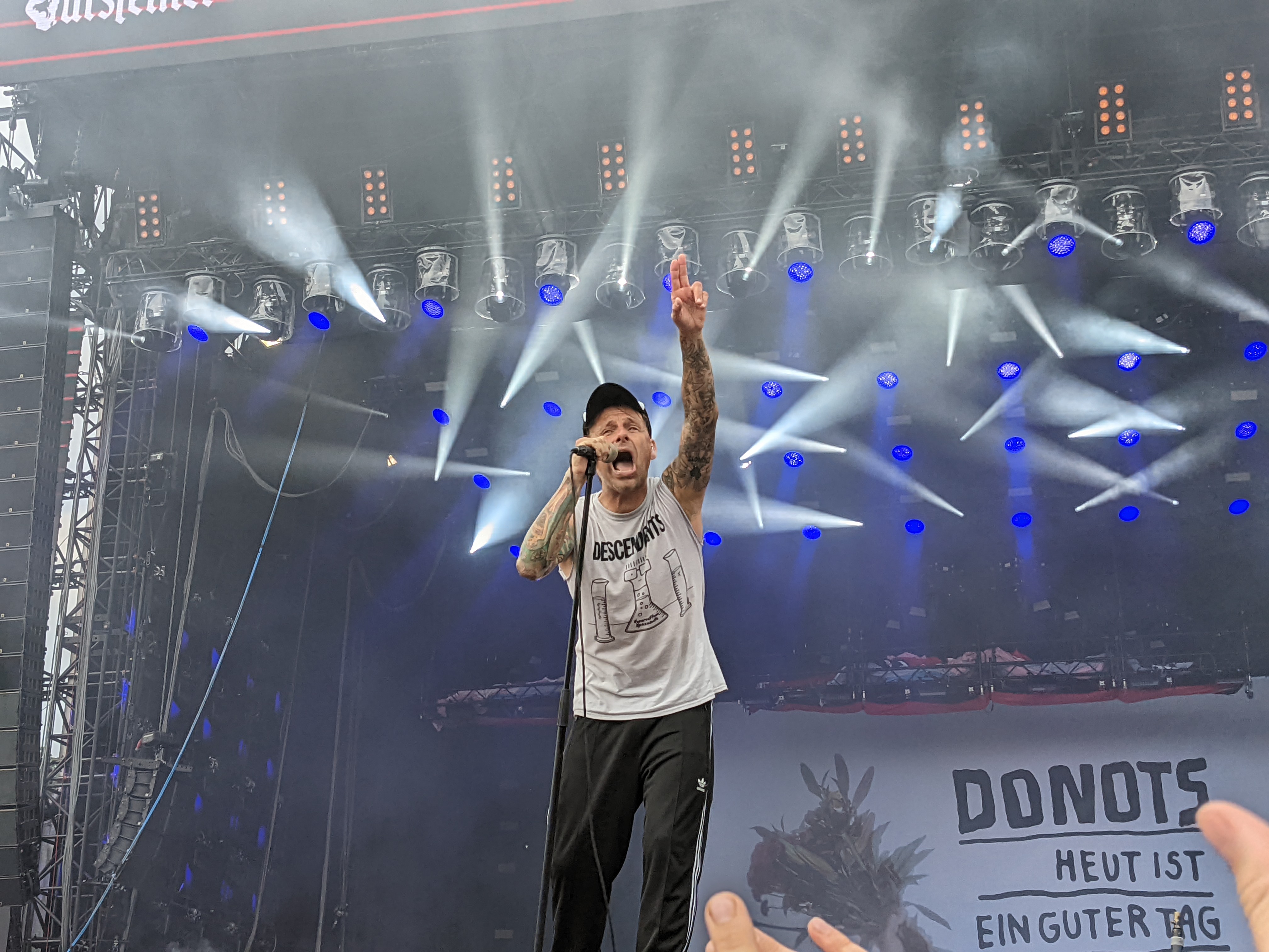 Die Donots hatten sich für Rock am Ring mit Absicht auf den Opener Slot setzen lassen, nun bei RIP eben am Samstagmorgen. Geladen wurde zum Frühsport, gegen den ein normales Fitness-Programm ganz schön abstinkt. Ausdauerlauf in der Circle Pit, Hochsprung für die Beine, Bauchmuskeln in der Mosphit, Oberarme durch ständige Crowdsurfer, die ja selber im Prinzip nur Planking betrieben haben. Das Infield war um kurz vor eins natürlich nicht voll, aber die Anwesenden hatten richtig Bock. Ich habe selten so eine Energie von Lied eins an bei einem Konzert gespürt.