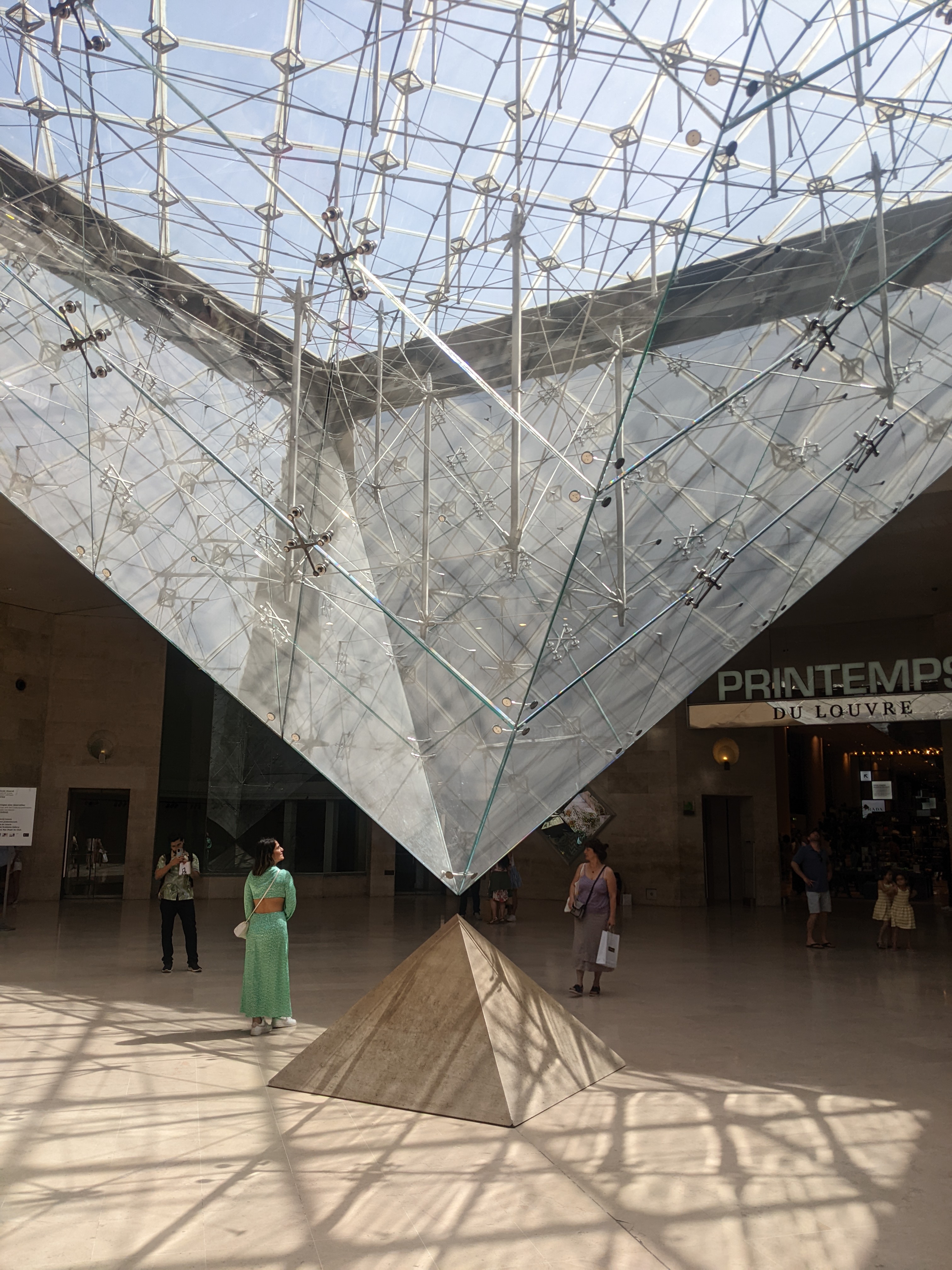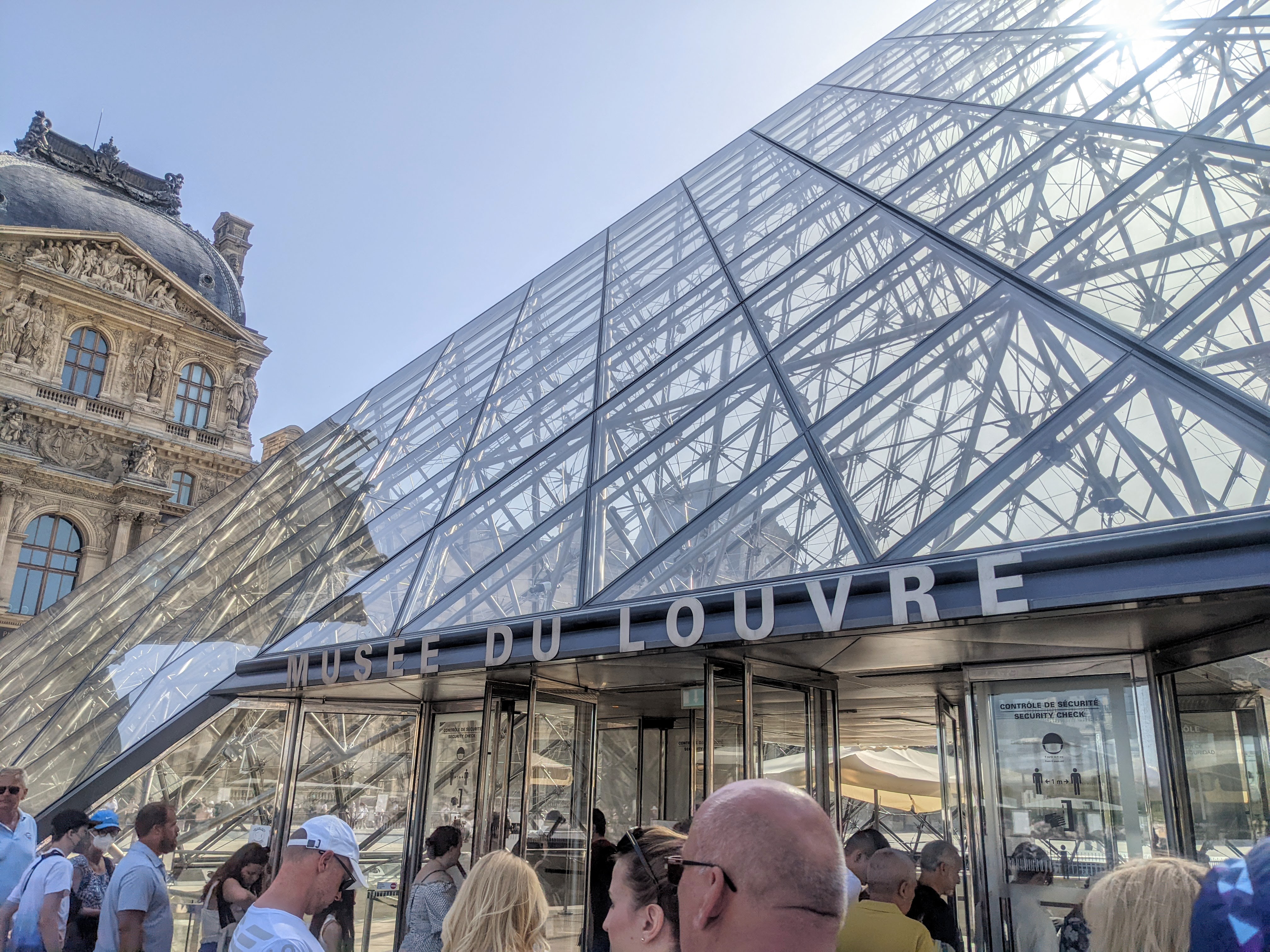 Ein Ticket für das Louvre hatte ich mir schon einige Wochen vorher gebucht, was sich als richtige Enscheidung herrausstelle. Nach einem außerordentlich mittelmäßigem Frühstück im Hotel bin ich schnell mit der Metro zum Pyramideneingang und musste dank des fixen Zeitslots um zehn Uhr nur wenige Minuten warten. Menschen die vor Ort ein Ticket kaufen wollten, haben schätzungsweise eine Stunde in der prallen Sonne stehen müssen.