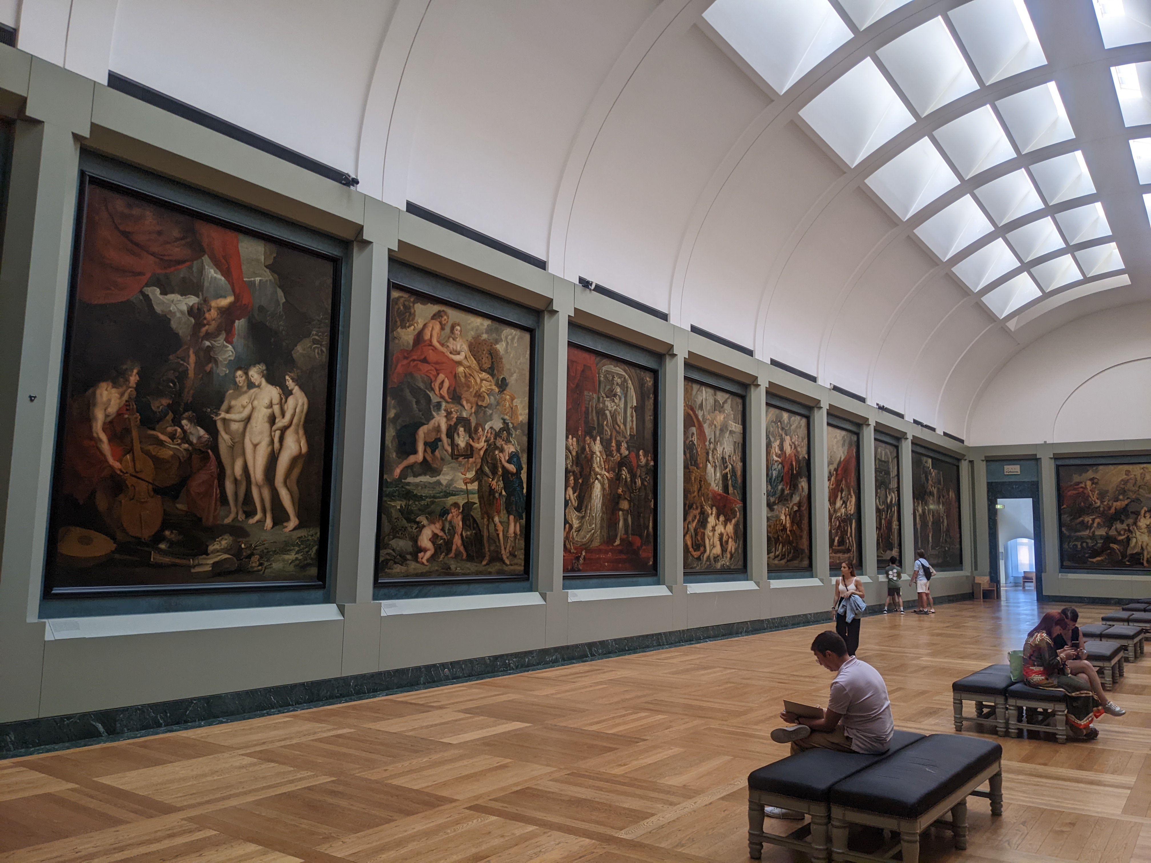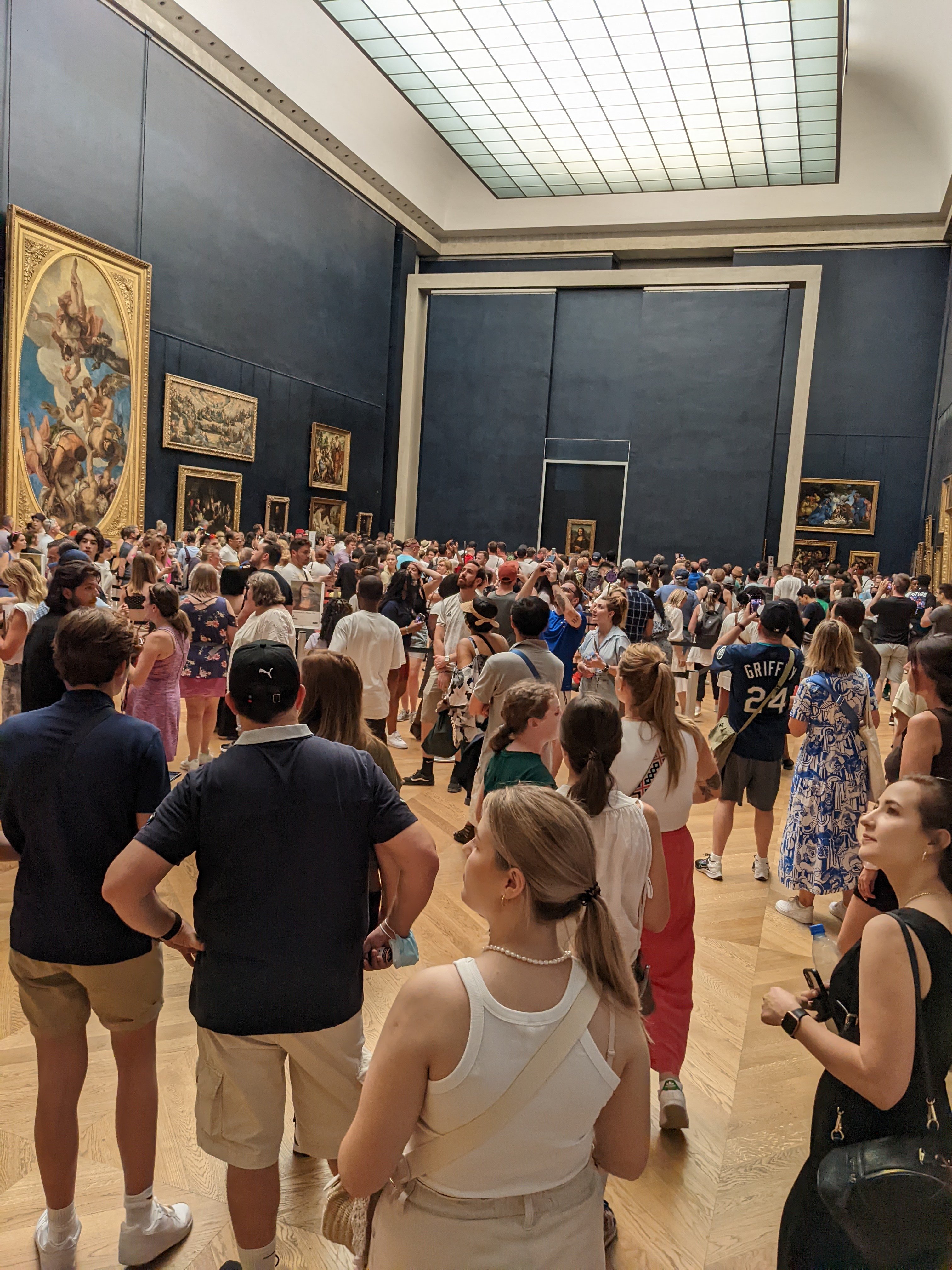 Gegen 14:30 bin ich dann aber zum Endgegner übergegangen. Die Grande Galerie im Denon Flügel, Ebene 1. Der beste Vergleich, der mir einfällt ist eine Circlepit. Vielleicht zu Musik von Ed Sheeran, das dürfte vom Tempo passen. Alles schiebt in eine Richtung. Wenn man mitten drin ist, muss man einfach mitmachen. Wenn man gegen den Strom arbeitet, bricht man sich die Knochen. Wenn man es an den Rand schafft, hat man eine Chance auf selbstbestimmtes Bewegen.