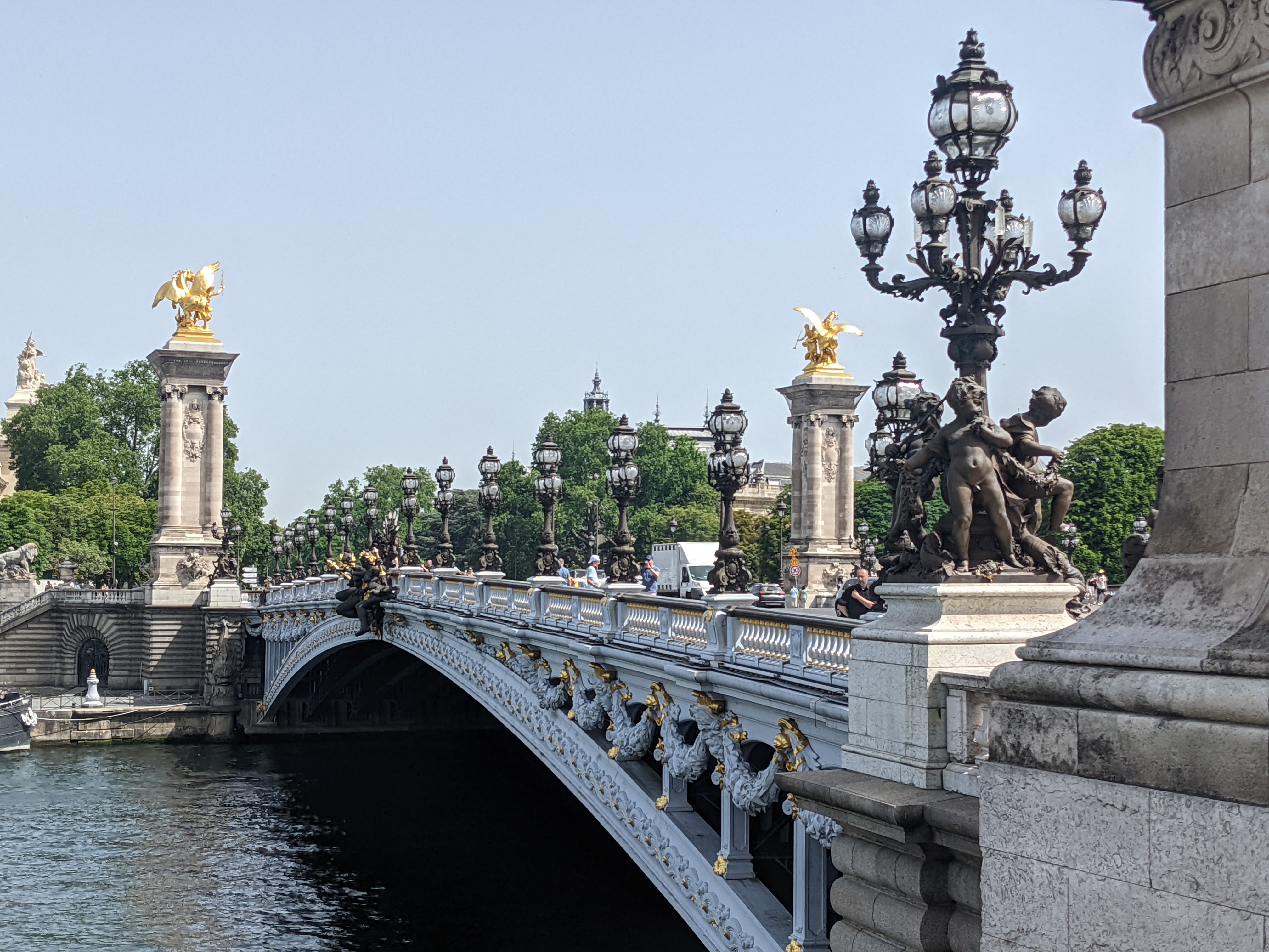 Das eigentliche Ziel des Tages war aber der Eiffelturm. Aus Montmartre sind es ein paar Meter bis dahin. Aber es ging mal wieder durch ein Viertel, was ich noch nicht kannte. Vorbei an Luxus Läden zur Pont Alexandre III. Wenn man nicht mehr weiß, wohin mit der Kohle und der Dekadenz, baut man eben mal so eine Brücke.