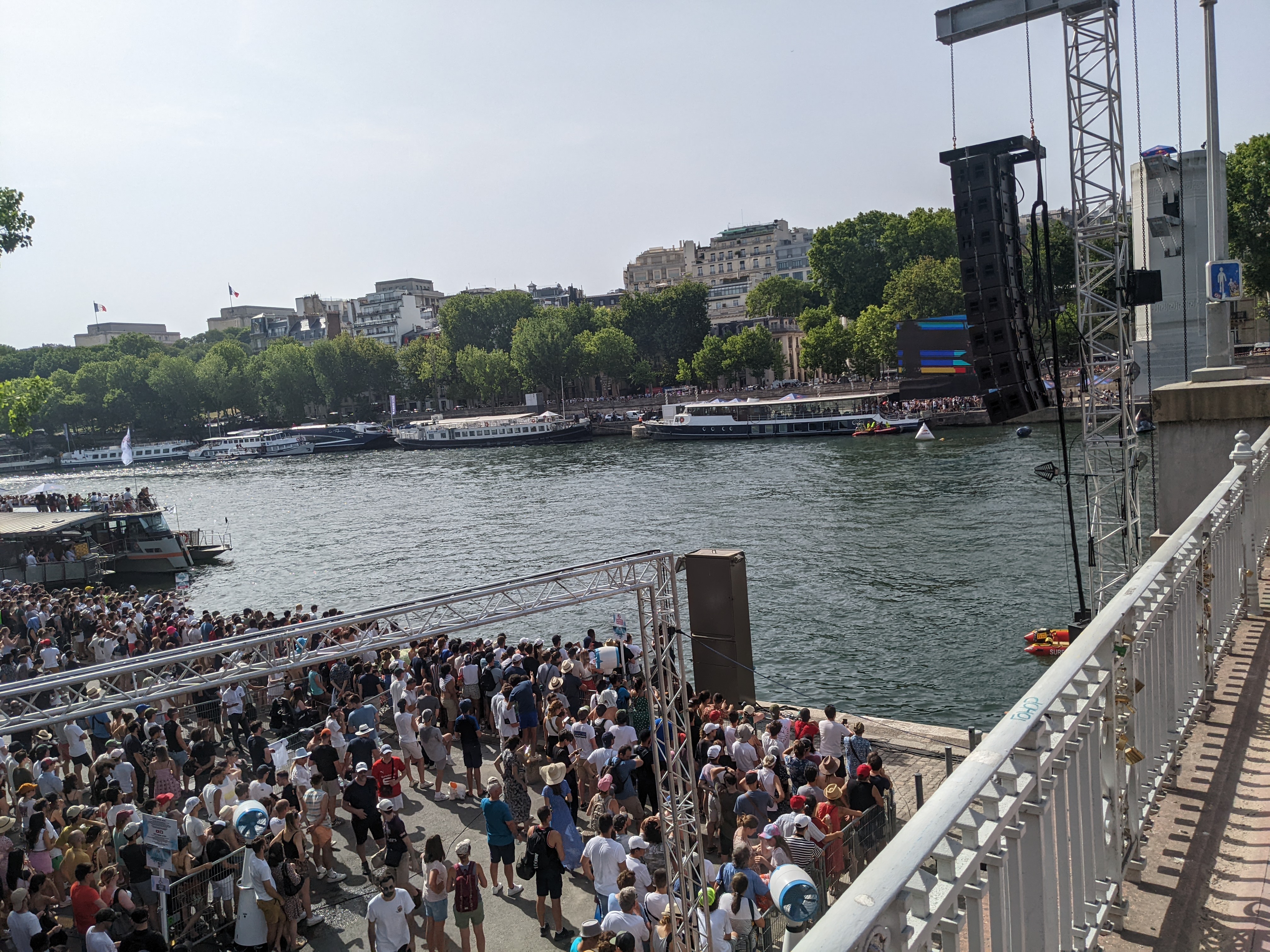 Auf dem Weg zum Eiffelturm am Vormittag hatte ich schon eine Menge aufgebauter Technik gesehen und laute Musik am Seine Ufer gehört. An diesem Samstag fand das Red Bull Cliff Diving in Paris statt. Turmspringen in die Seine. Typisch für ein Red Bull-Event - so aufgezogen, dass es auch ohne irgendeine Ahnung von dem Sport eine gute Show ist. Das hab ich mir bestimmt eine Stunde lang angeschaut. Gute Musik, glückliche Menschen mit guter Stimmung und ein bisschen Unterhaltung. Wobei die Schattenplätze bei weiterhin knappen 40℃ und keiner Wolke am Himmel begehrt waren.