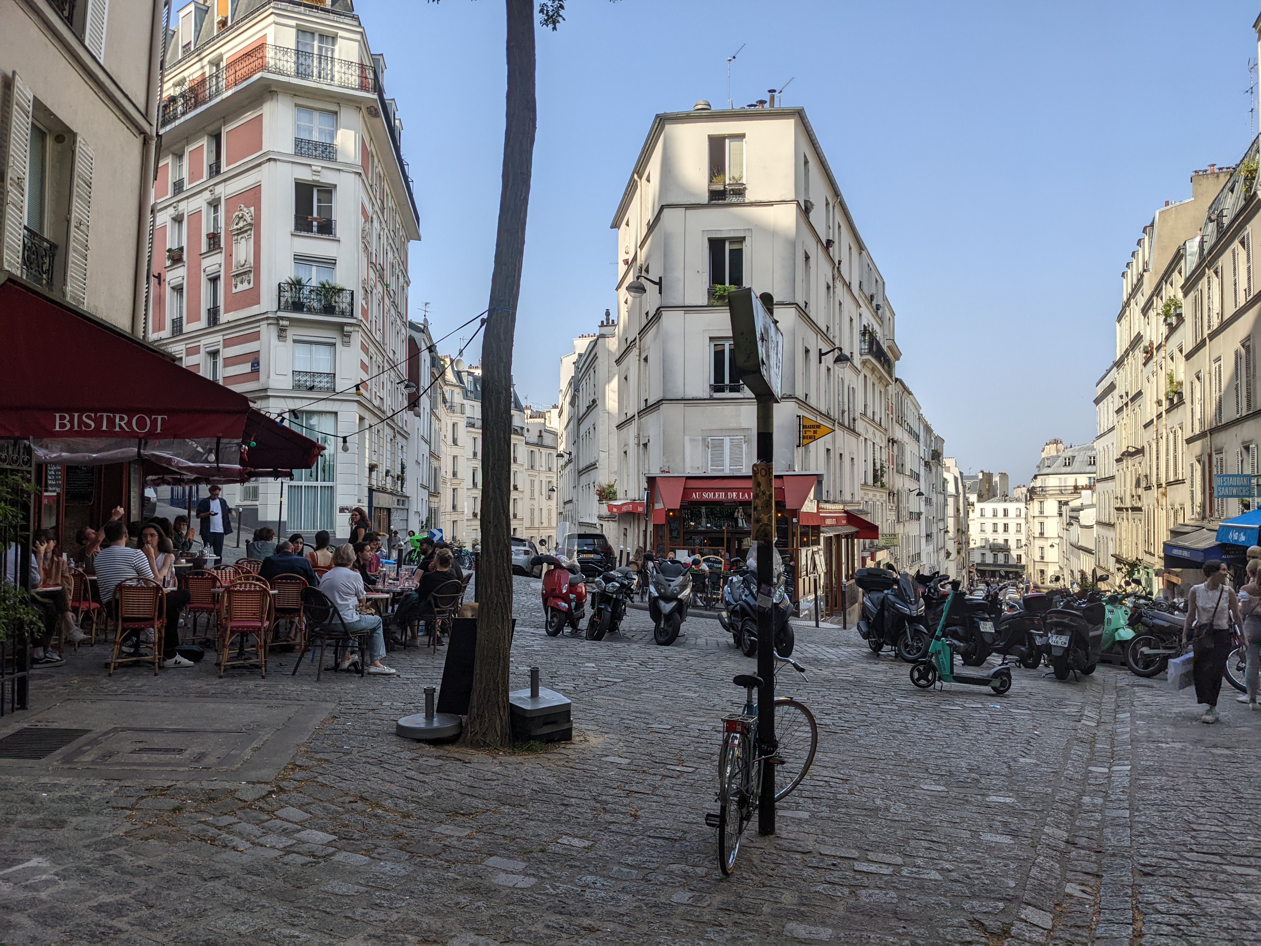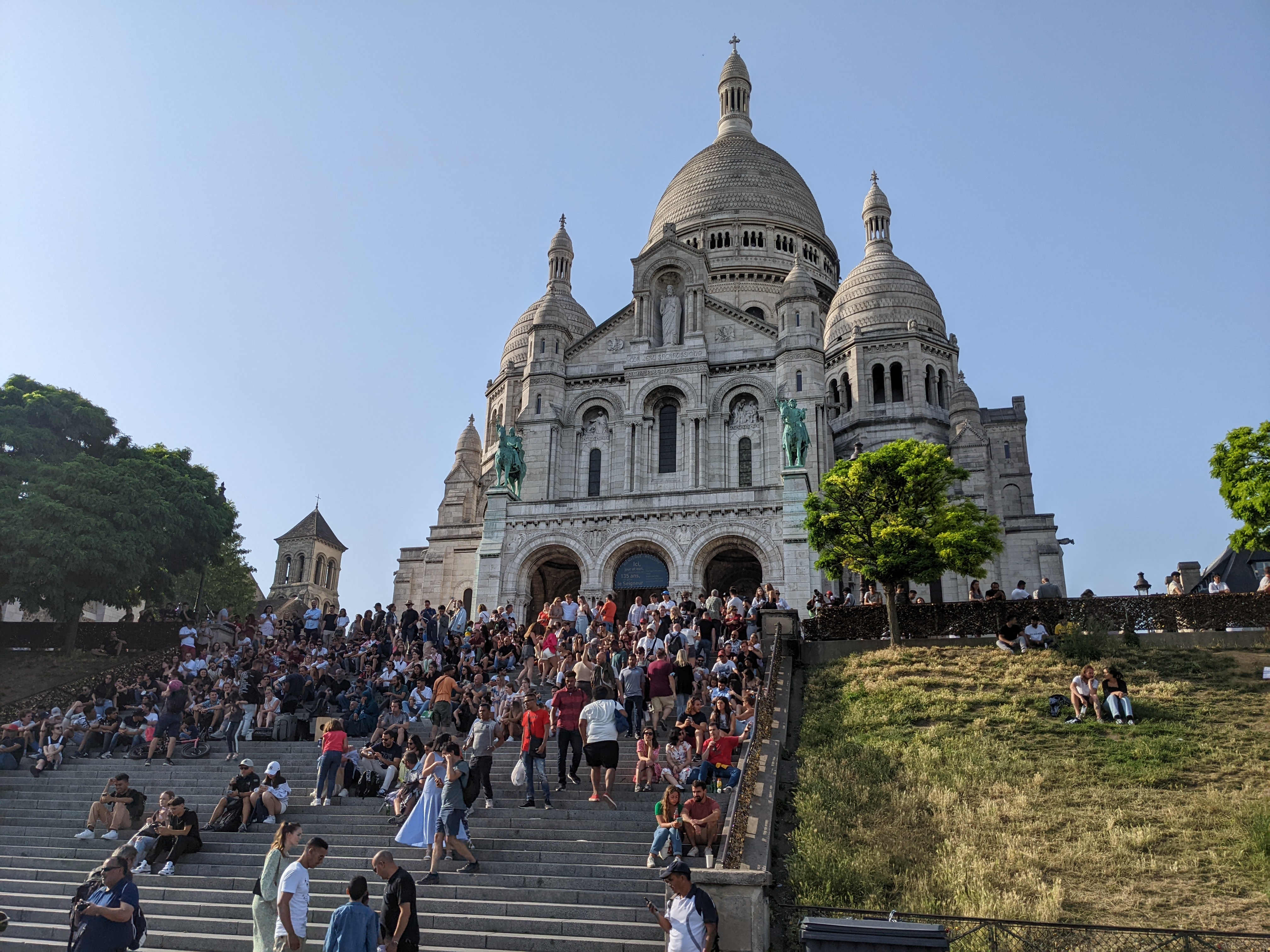 Nach einem kurzen Abstecher ins Hotel, um das Buch wegzubringen, machte ich mich auf nach Montmatre. Einerseits zum Abendessen, andererseits um das Viertel nochmals in belebt zu erleben. Die Entscheidung, mich um kurz vor sechs schon vor die Bar “Carotte Bleu” zu setzen, war genau richtig. Ich war der einzige Gast und konnte mich mit dem Inhaber unterhalten. Anscheinend einer der wenigen Menschen in Paris, die freiwillig und gut Englisch sprechen. Mir wurde empfohlen, nochmals bei Sacré-Cœur vorbeizuschauen, weil dort abends oft gute Live-Musik sei.