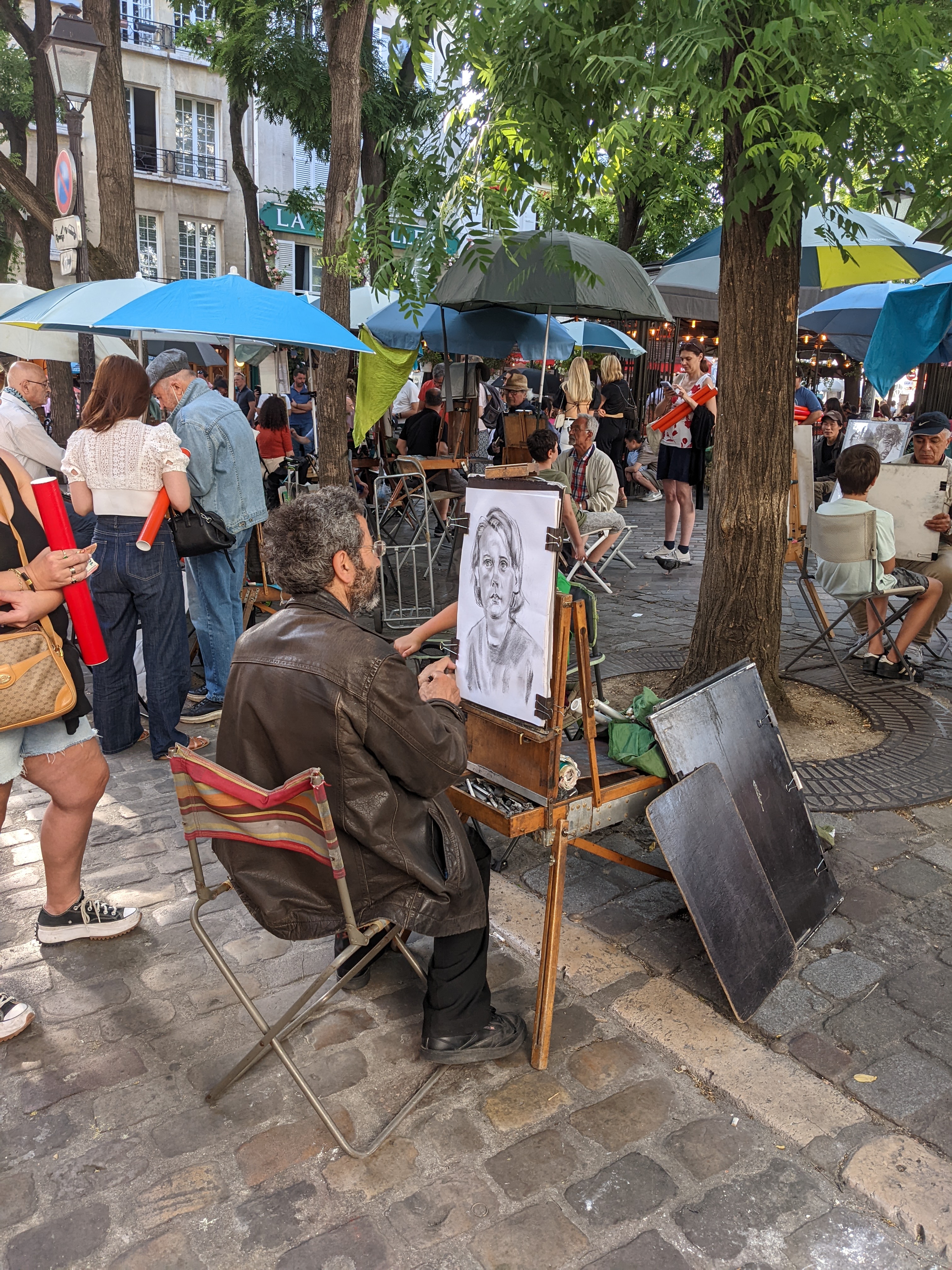 Der Künstlerplatz bzw. die ganze Gegend um den Place du Tertre war belebt mit Menschen, aber nicht mehr so absurd voll wie erwartet. Abendessen und den Besuch zu tauschen, war wohl richtig. Ich schaute mir zwei spannende Galerien an, auch die Straßenmaler waren beeindruckend. Und dem typischen Touri-Krams wie Kühlschrankmagneten und Schlüsselanhängern ausweichen, bekommt man hin.