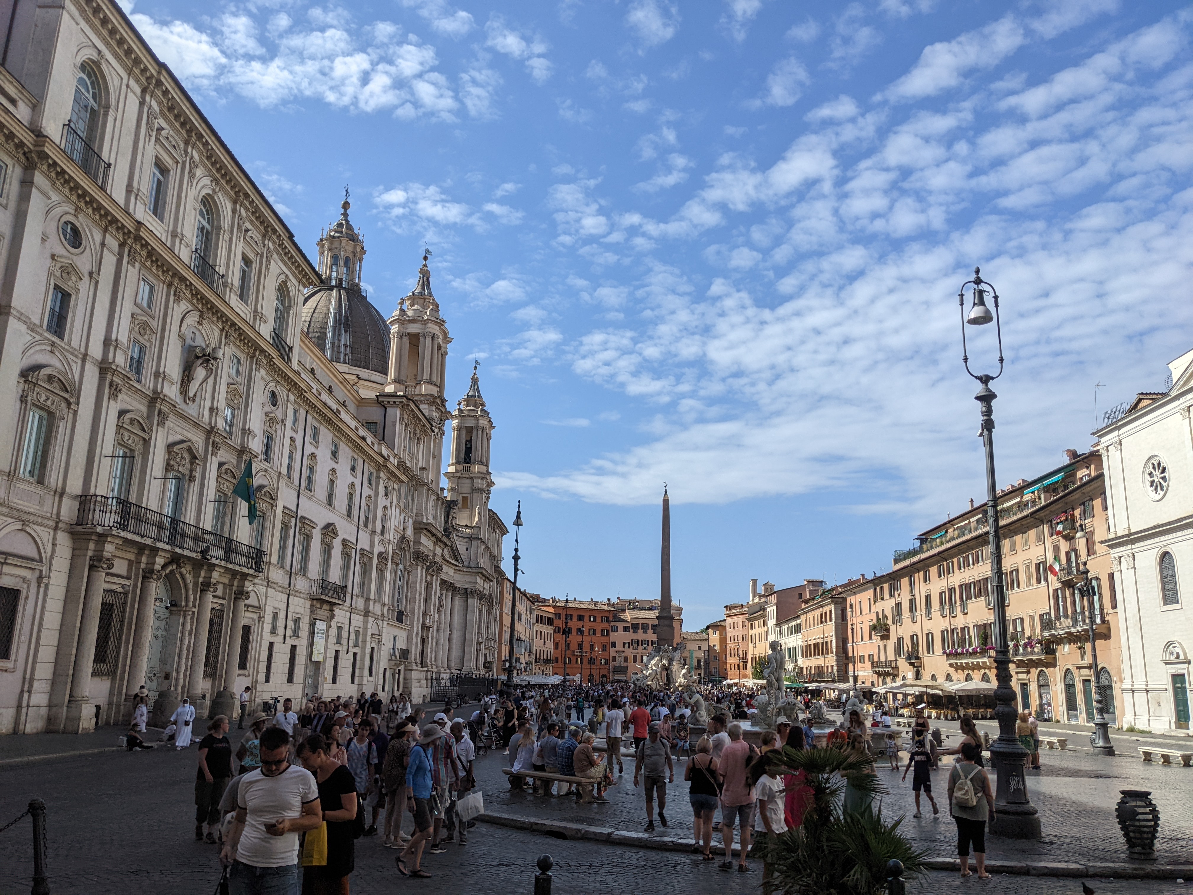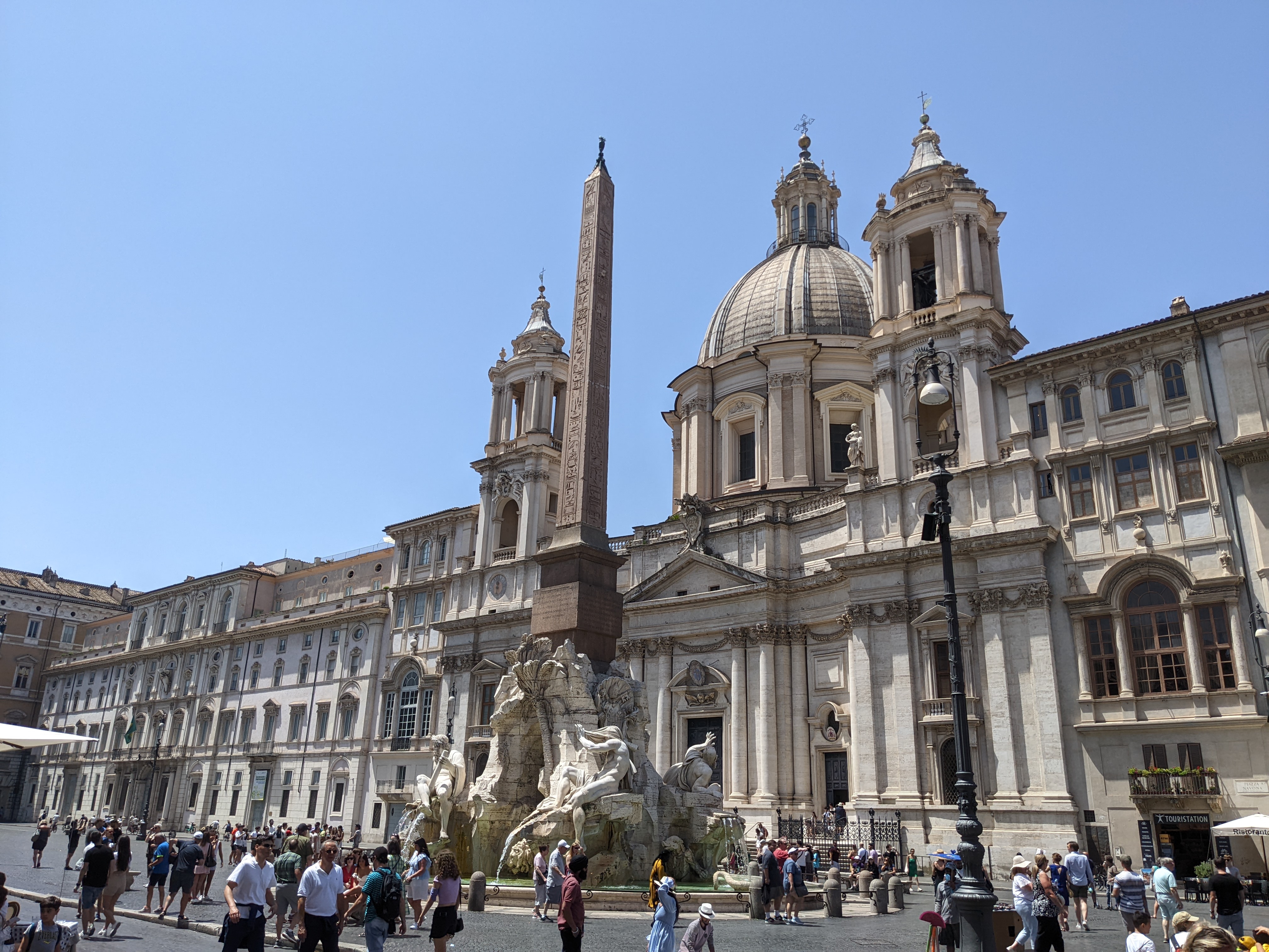 Naja gut, auf zum Pantheon. Das war gar keine gute Idee, dort war eine mindestens 300 Meter lange Schlange und am Sonntag hätte man dazu noch eine Reservierung gebraucht. Also weiter zu Piazza Navona. Die war mit ihrem Vierströme-Brunnen schon irgendwie cool, aber ein ordentliches Foto vom Fontana dei Quattro Fiumi war einfach nicht drin. Krass viele Menschen.