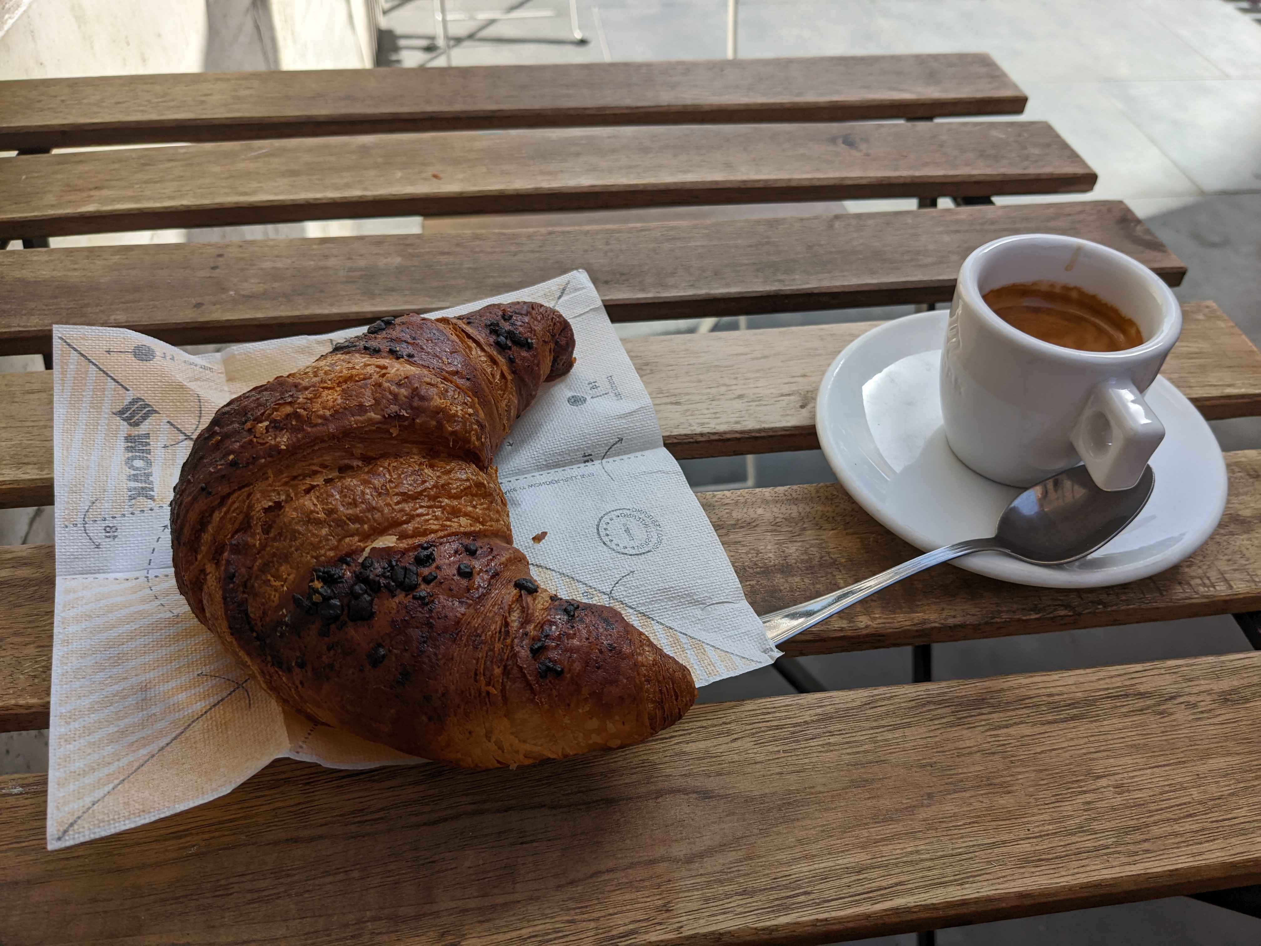 Also um die Ecke in das kleine Café hinein, was ich am Abend vorher schon gesehen hatte. Die Franzosen machen zwar die besseren Croissants, aber die Italiener den besseren Kaffee bzw. Espresso. Eine der sehr netten Aspekte in Italien ist, dass es einen Espresso - egal wo - für grob einen Euro gibt. Unrühmliche Ausnahme ist der Freizeitpark Venedig. Aber da will ich auch nicht wieder hin.