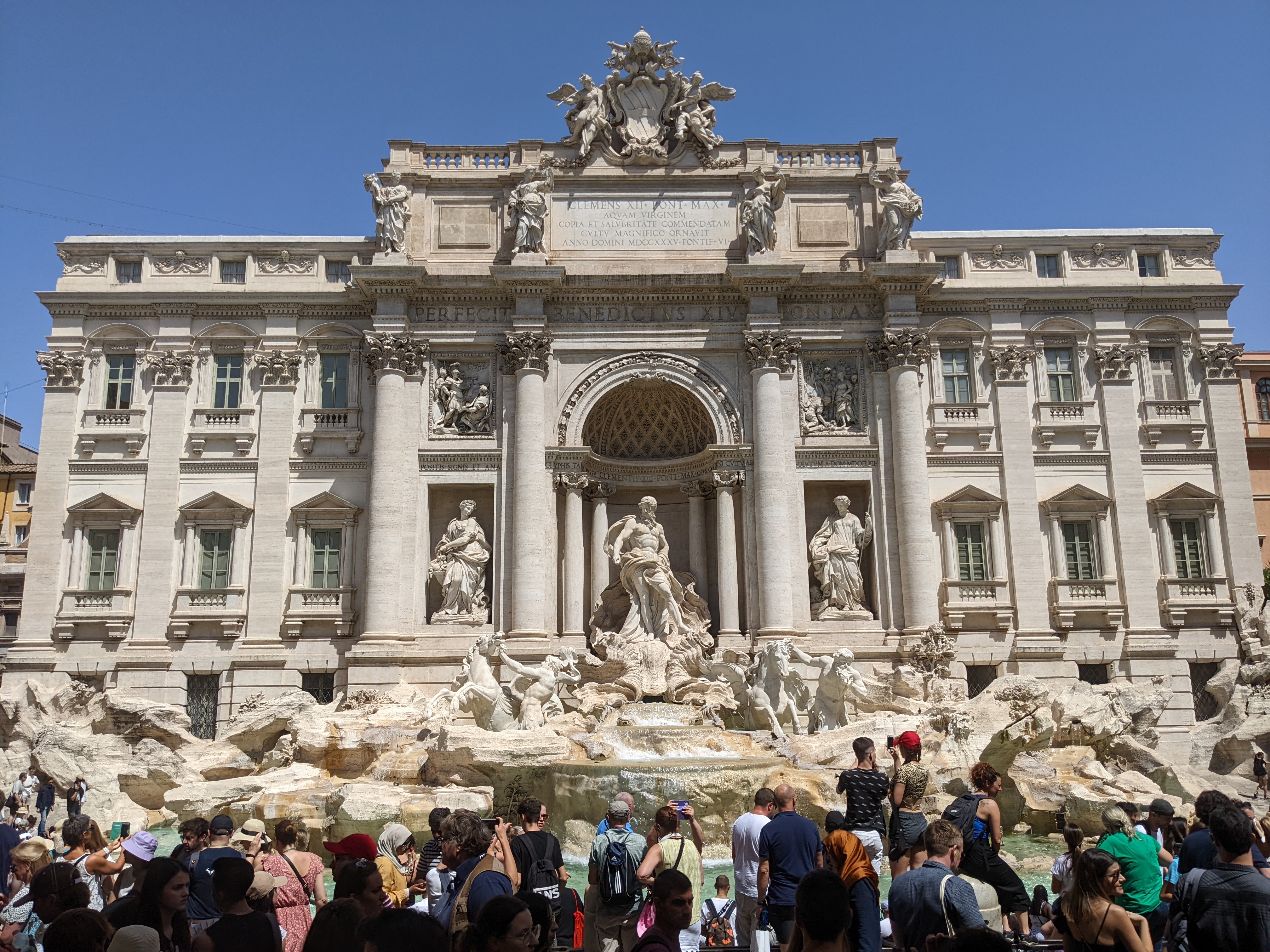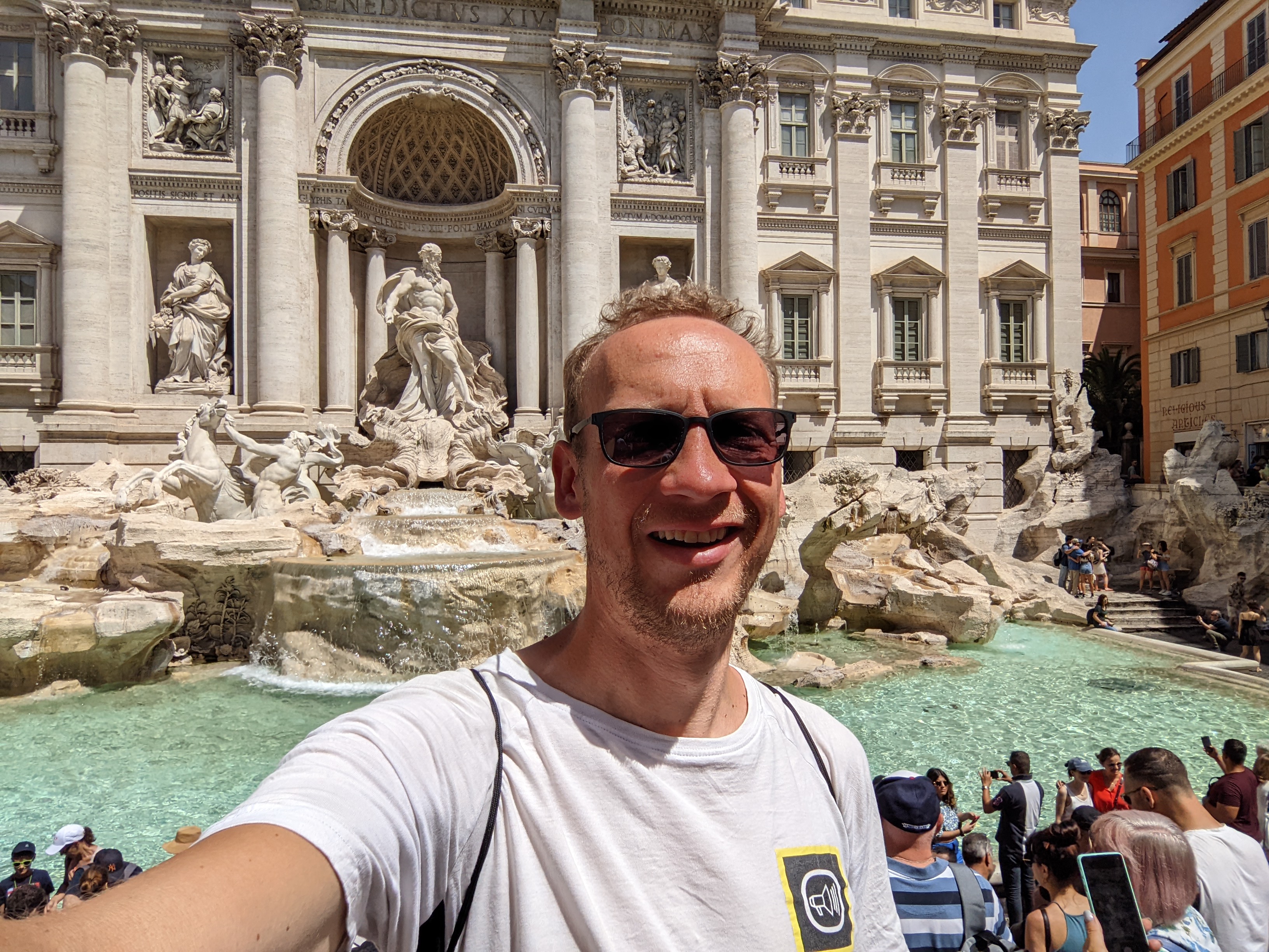 Ich bin danach zum berühmten Fontana di Trevi. Ja, sollte man mal gesehen haben. Aber eigentlich sieht man Menschen, die ihre Kameras und Mobiltelefone mal schlechter, mal erträglich bedienen. Im Hintergrund ist dann irgendwo der Trevi-Brunnen. Der sieht tatsächlich cool aus, aber man bekommt einfach keinen freien Blick darauf. Krass viele Menschen.