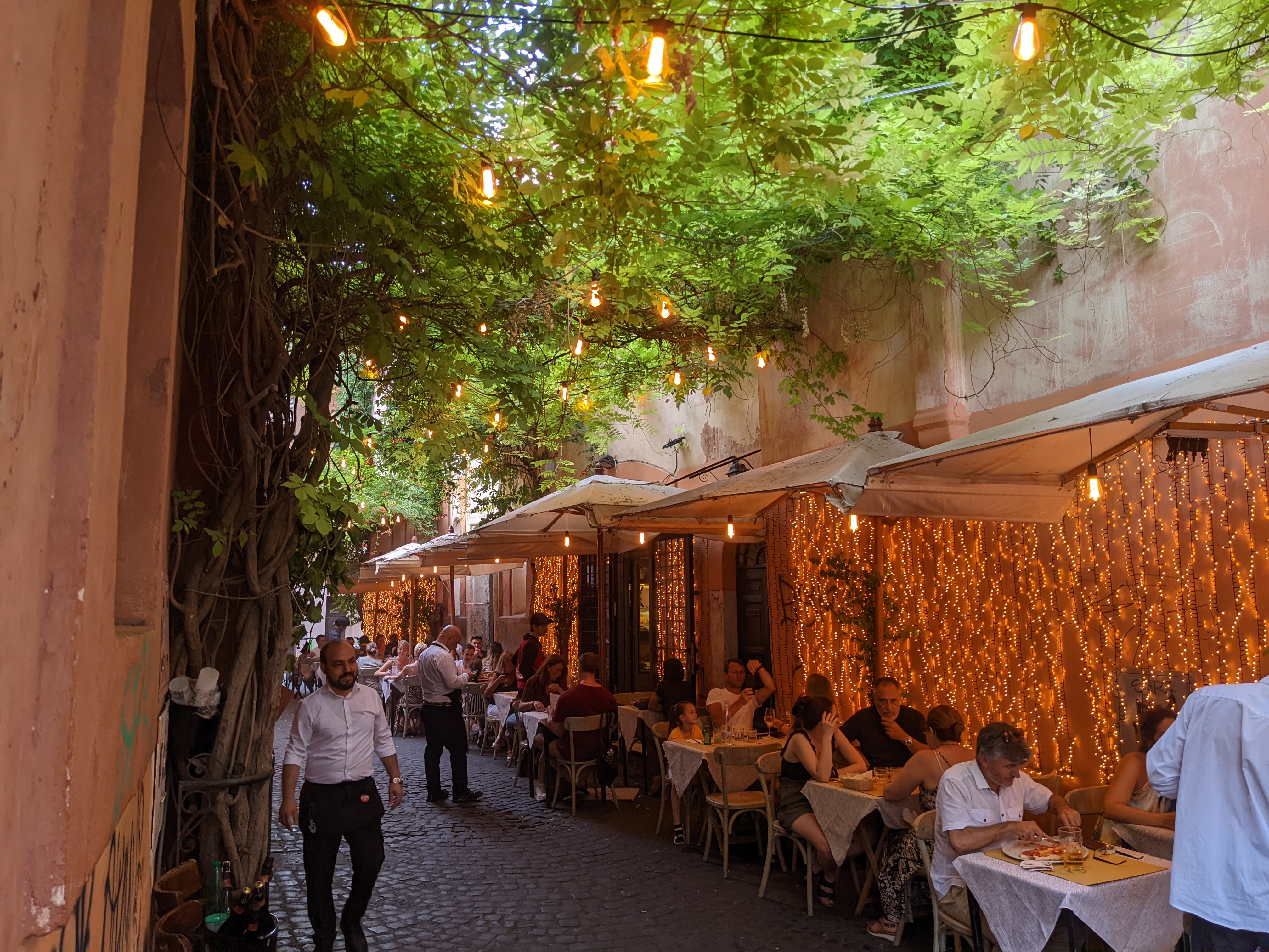 Nach dieser Pause im Kühlen ging es zum Abendessen in den Stadtteil Trastevere. Für römische Verhältnisse ein sehr progressiver Stadtteil. Also viele junge Menschen, die mit nem Bier/Wein in der Hand durch die Gegend laufen, Straßenmusiker, Streetart. Vorallem gibt es dort super viel leckeres Essen, ab der traditionellen italienischen Küche.