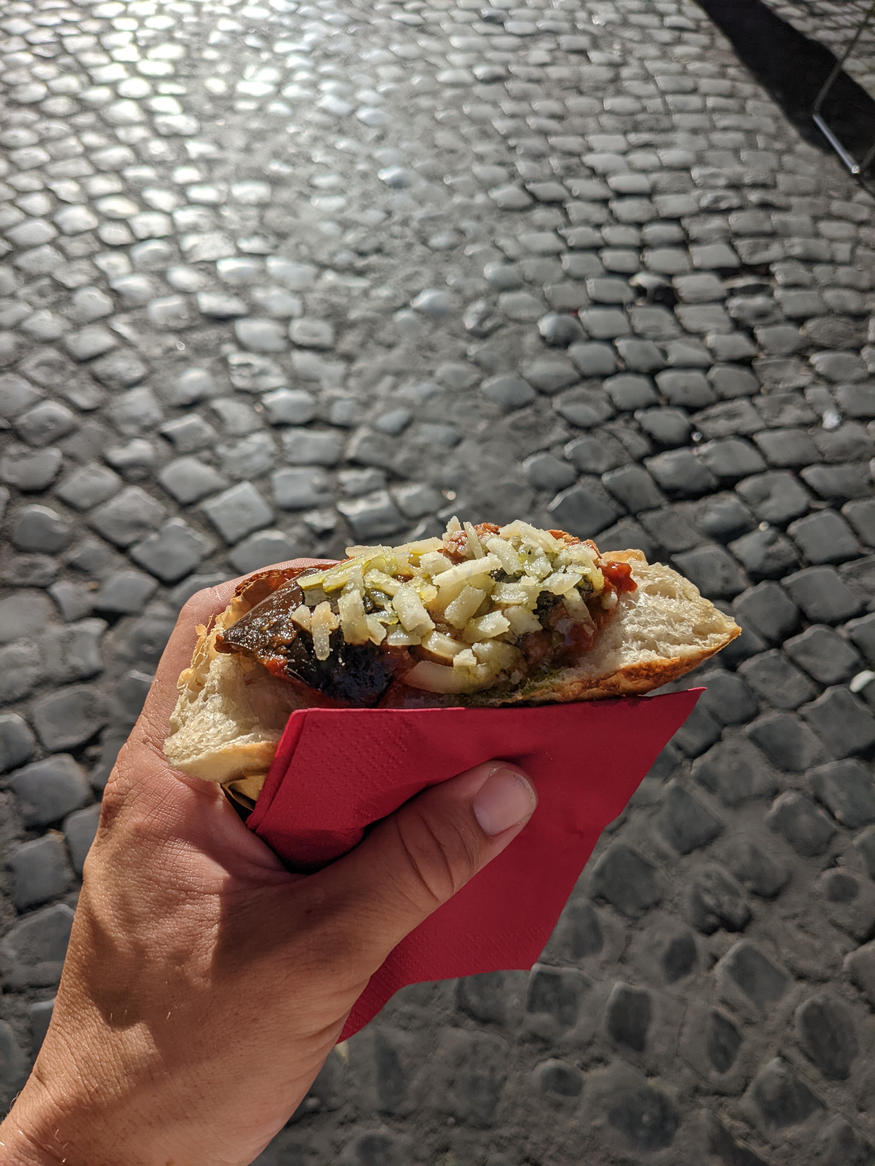 Ich hab anscheinend ungeplant mit einem Trapizzino das gehypte Streetfood von Rom schlechthin erwischt. Zumindest wollte man mich das mit dem Hype so glauben lassen. Aber eine Pizza Tasche mit krossem Fladenbrot und verschiedenen leckeren Zutaten ist einfach lecker.
