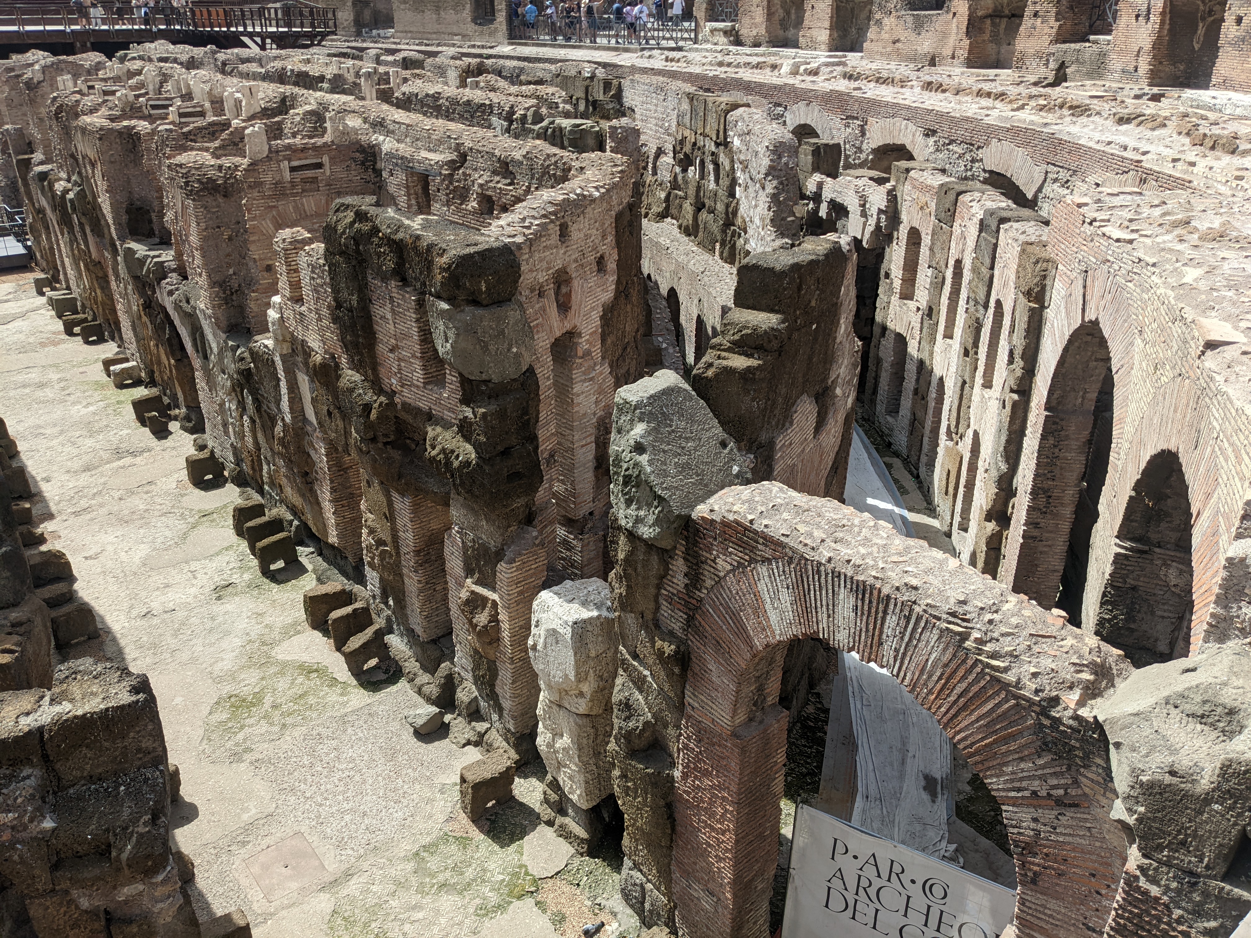 Unter dem (teilweise nachgebauten) Holzboden wurden wohl in verschiedenen Gängen mit Käfigen die Tiere, Gladiatoren etc. gehalten, um sie über Rampen und Bodenklappen in die Arena zu lassen. Einen dieser wilden Tiger habe ich schlafend auf dem Rang gefunden. Hatte sich wohl verlaufen.