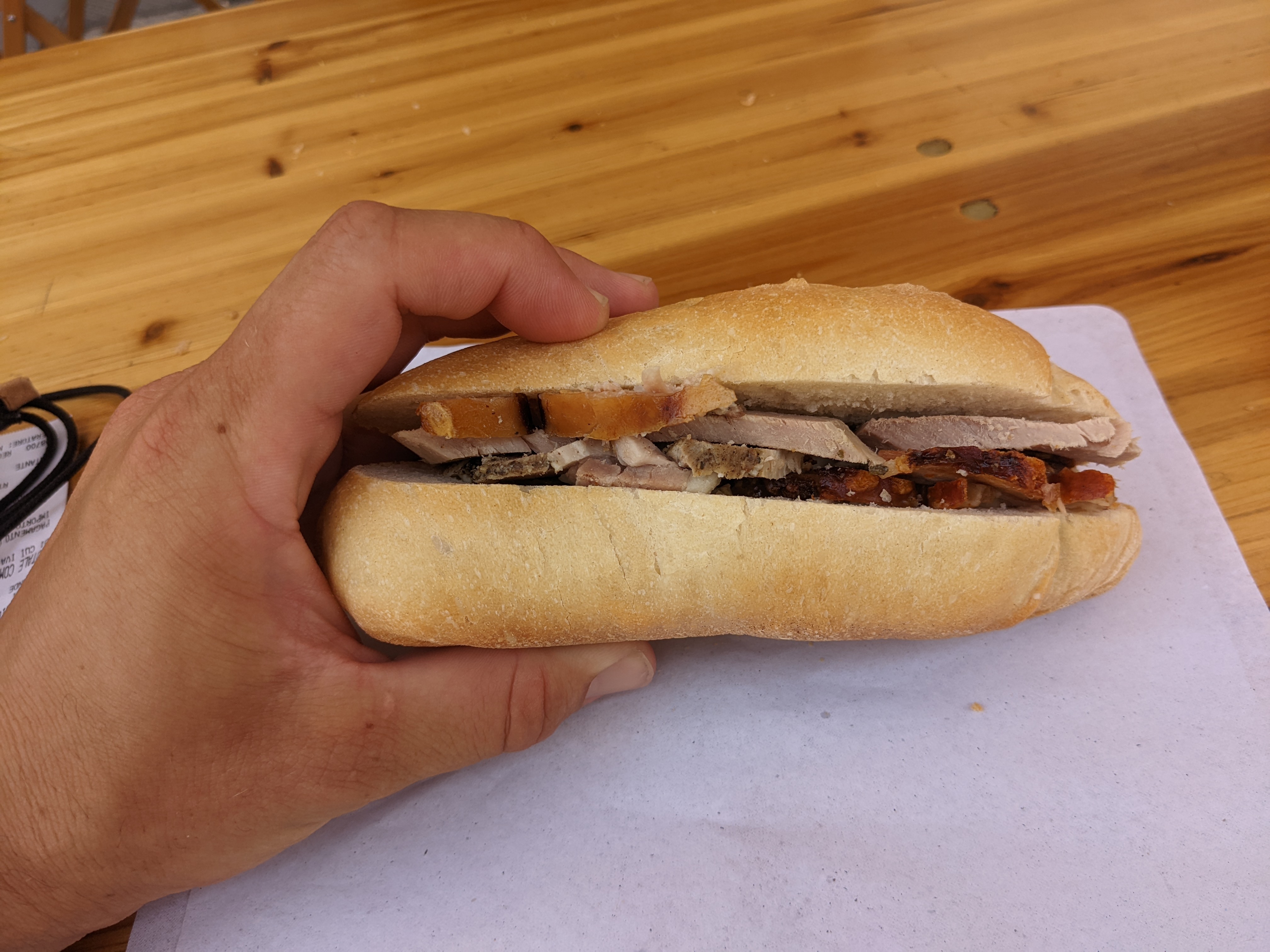 Da ich so langsam Hunger hatte, bin ich einige Kilometer durch die Stadt zu einen Geheimtipp. Wenn man es genau nimmt, ist er wohl nicht ganz so geheim, sondern aus The Food of ROME | A Day in the Eternal City . “Panino con porchetta” ist eine römische Spezialität, die jeder, der Schwein isst, probiert haben sollte. Ich hab an dem Tag extra eine Ausnahme dafür gemacht. Ein kalter Schweinebraten, der im Er Buchetto auf einem Panini serviert wurde.