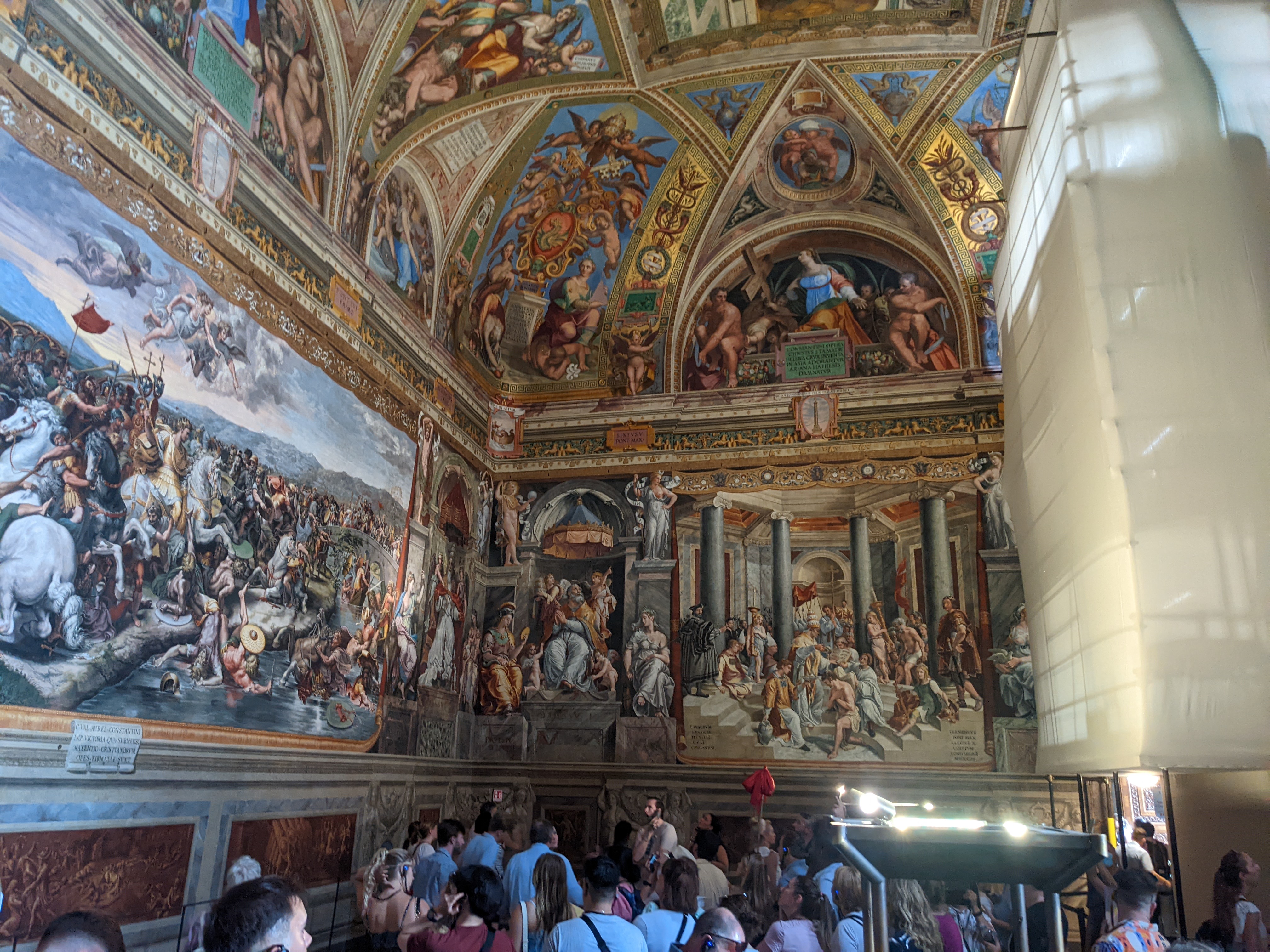 Die Sixtinische Kappele an sich fand ich nichtmal besonders spannend. Ein Quader von Raum, architektonisch wenig beeindruckend. Und Wandmalerreien hat man einfach vorher schon echt viele gesehen. Klar, die Malereien da drin sind größtenteils von einem der vier Ninja Turtles gemalt und zeigen die biblische Geschicte vom alten und neuen Testament. Aber mich hat die Kapelle enttäuscht.