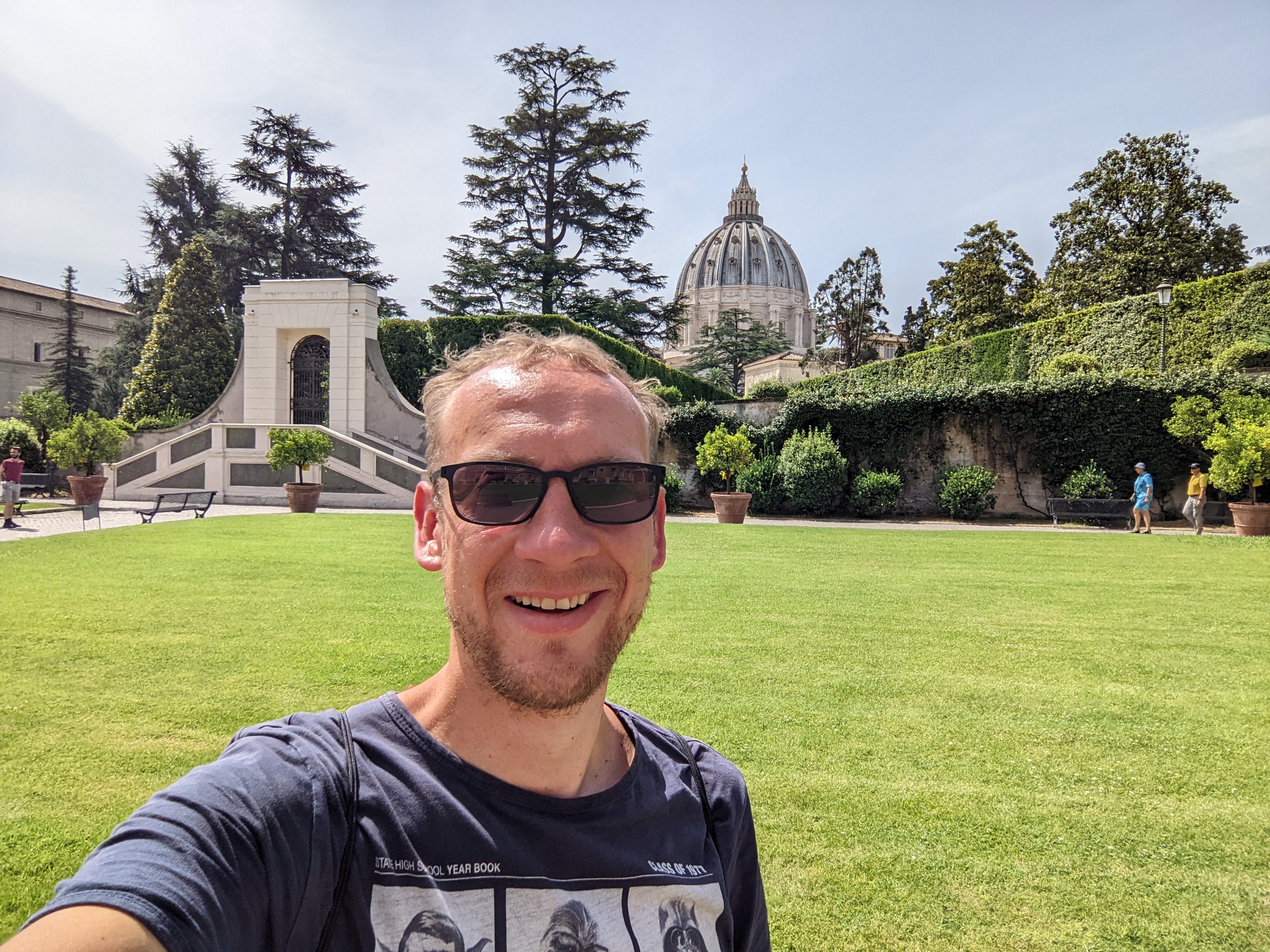 Nach grob zwei Stunden und einem Spießrutenlauf durch Restaurants und Souveniershops am Ende landete ich in einem kleinen, abgetrennten Bereich der Vatikanischen Gärten. Angedacht als Bereich zum draußen Essen, aber wirklich schön. Ich würde gerne mal in die richtigen Gärten hinter der Mauer. Aber dafür muss man wohl von How to become Pope zumindest ein paar Schritte gehen.