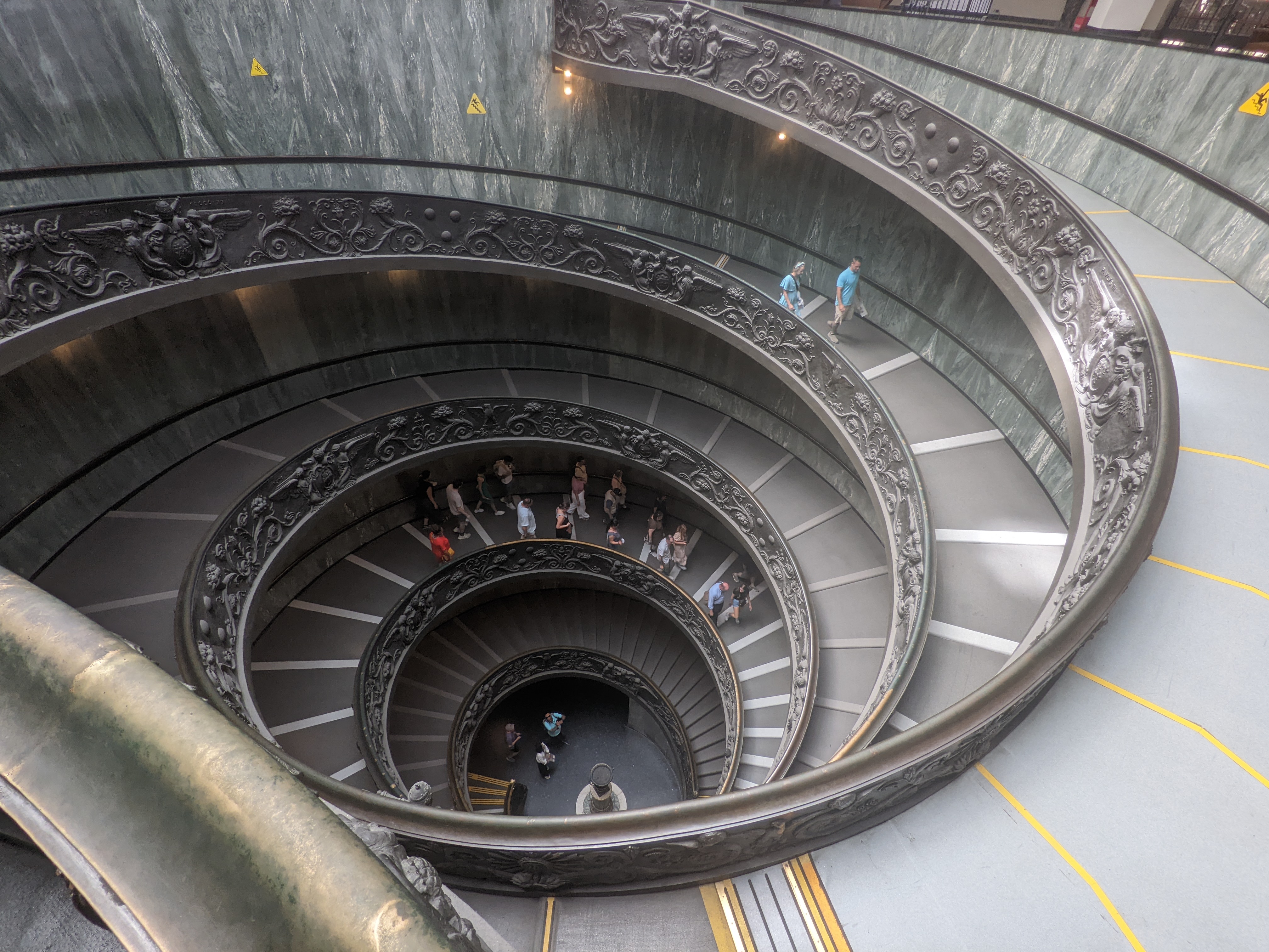 Nach der Entspannung draußen gab es unerwarteterweise noch eine Ausstellung mit Kunst aus Südamerika zu sehen, die mir gut gefallen hat. Und dann ging es über die riesige runde Treppe wieder aus dem Vatikan heraus.