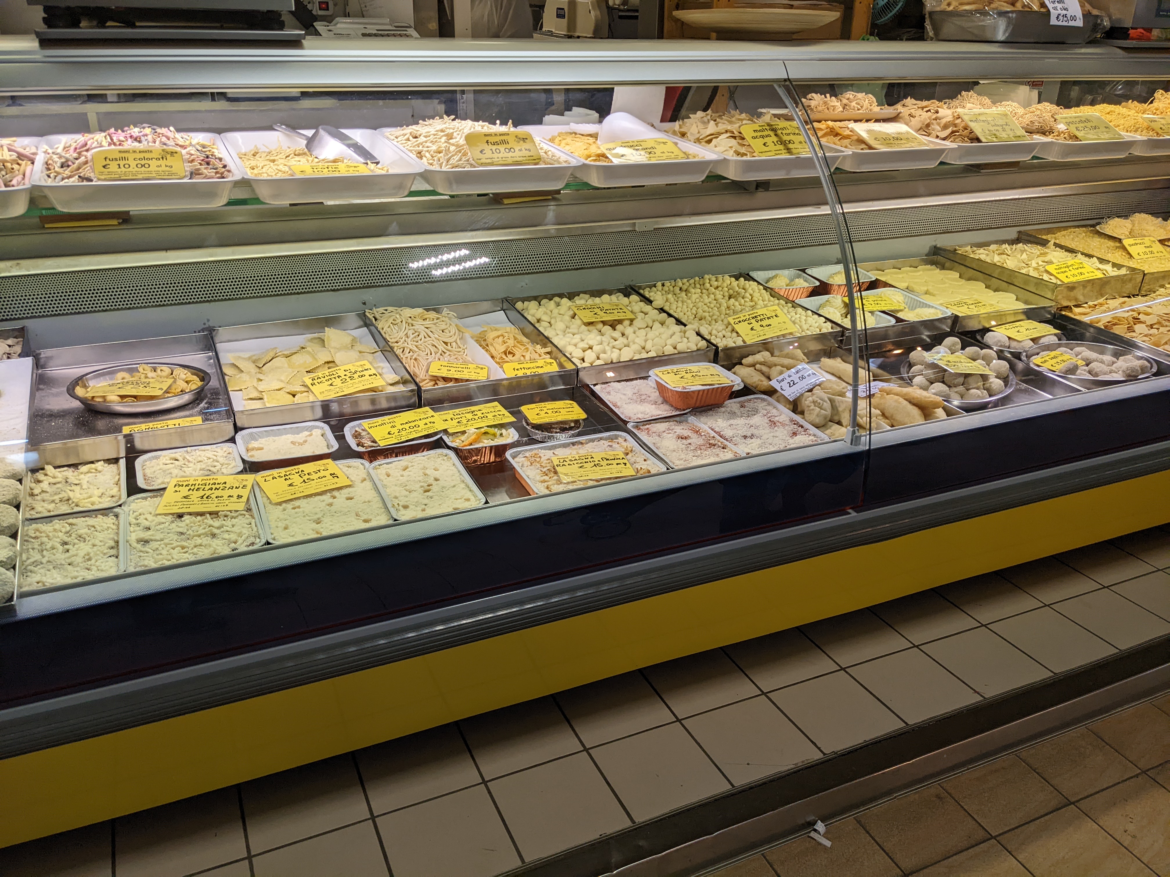 Bei einem der Bäcker hab ich mir ein Focaccia mit Tomaten gekauft. Richtig lecker! Allerdings war dieser Markt einer der wenigen Orte, wo man Bargeld benutzen musste. Dafür gab es praktisch keine Touries. Witzig war die Theke für ausschließlich frische Nudeln aller Art. Sowas hab ich noch nicht gesehen, aber wenn nicht in Rom, wo soll es so etwas sonst geben.