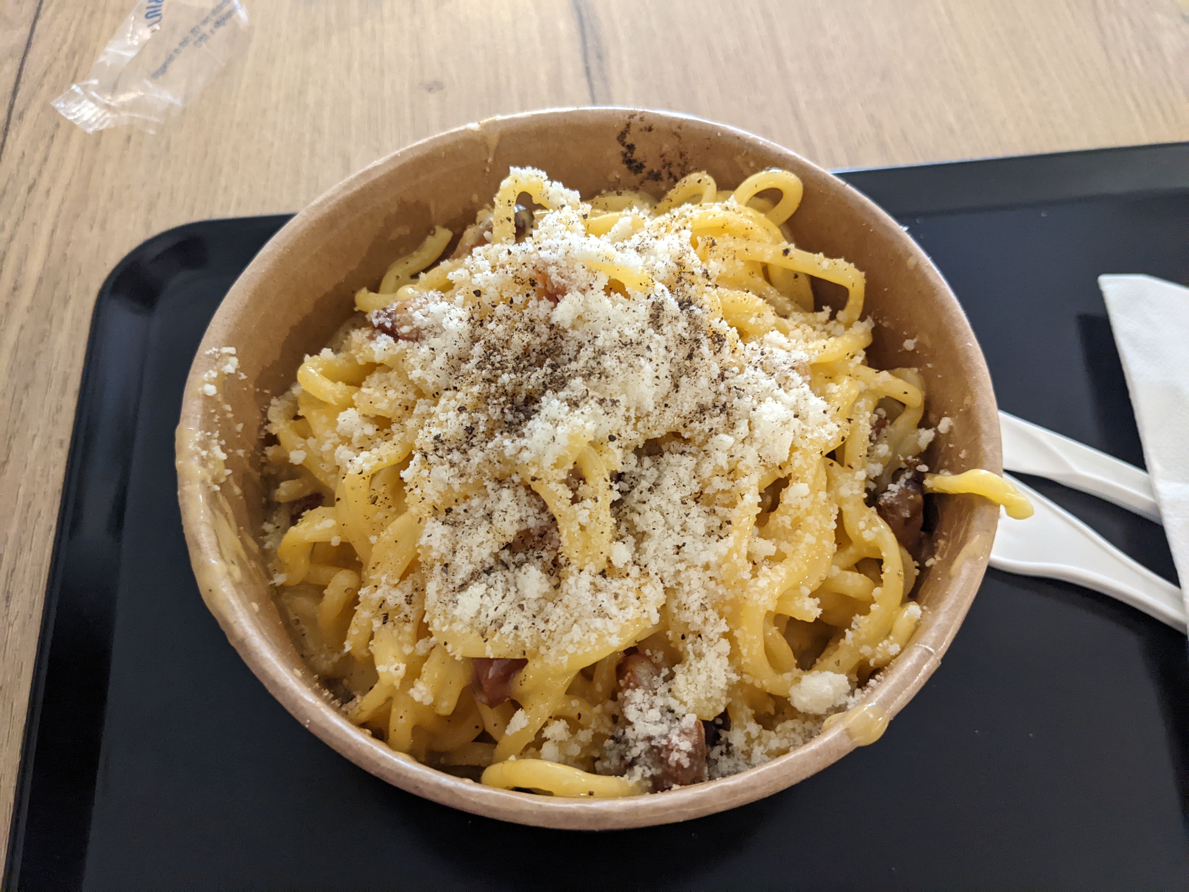 Das hat besser funktioniert als erwartet. Ich bin eine leicht andere Route als die Tage davor gelaufen und an einem Fast-Food Nudelladen vorbei gekommen. Man kann sich das in etwa wie ein Vapiano in Deutschland vorstellen. Das meiste an Basics ist vorbereitet und geschnitten, dann wird daraus live eine leckere Portion Nudeln mit Soße nach Wahl produziert. Nur das eine Persion kassiert und die Zutaten zurrchtlegt und die andere auf sechs Platten auf einmal ganze viele Gerichte auf einmal jongliert. Als wäre das nicht schon beeindruckend genug zu sehen, war das Ergebniss eine leckere Cabonara. Also eine richtige, nach italienischem Rezept mit Eiern, Guanciale, Parmesan und sonst nicht viel dazu. Richtig lecker.