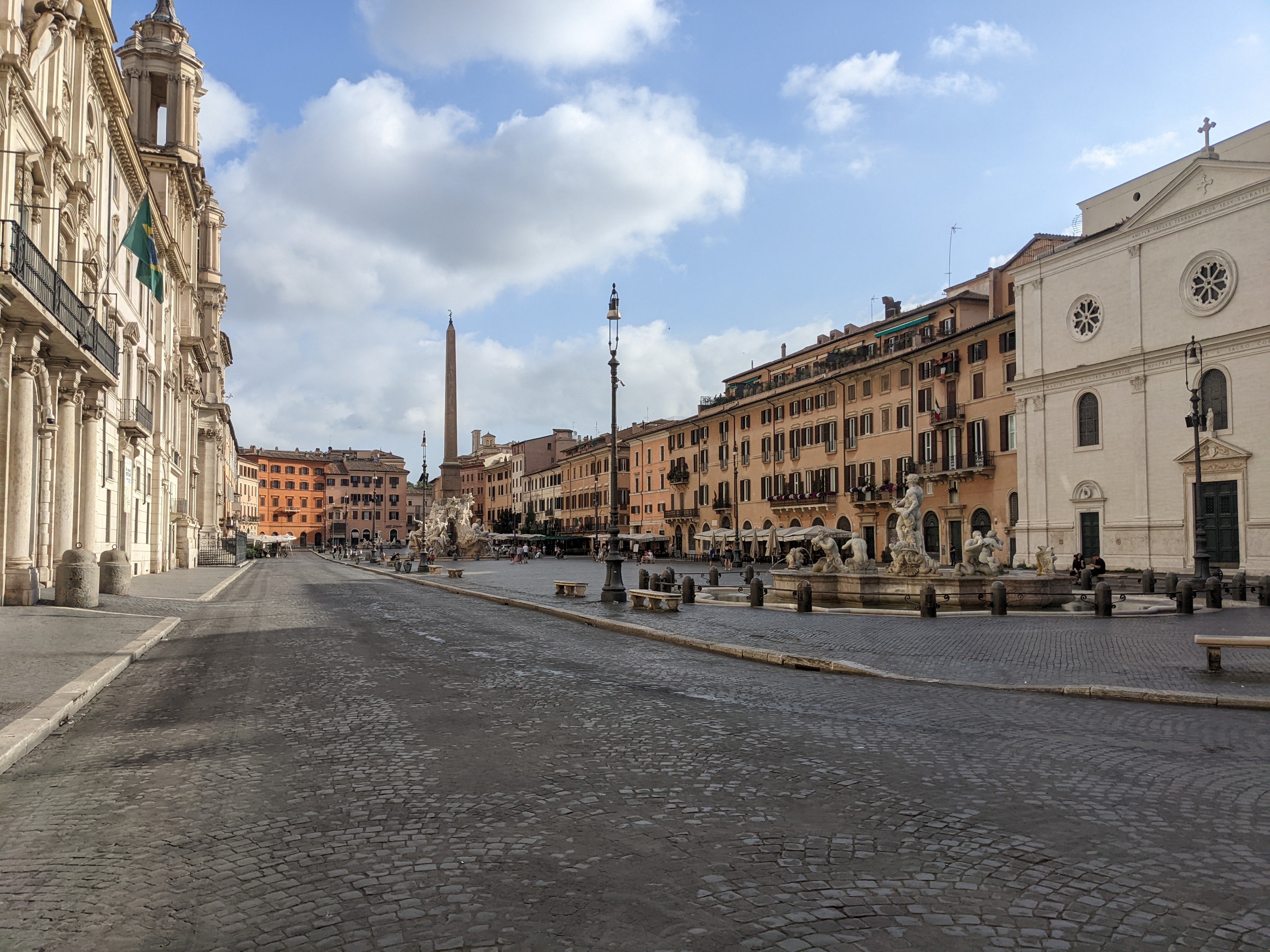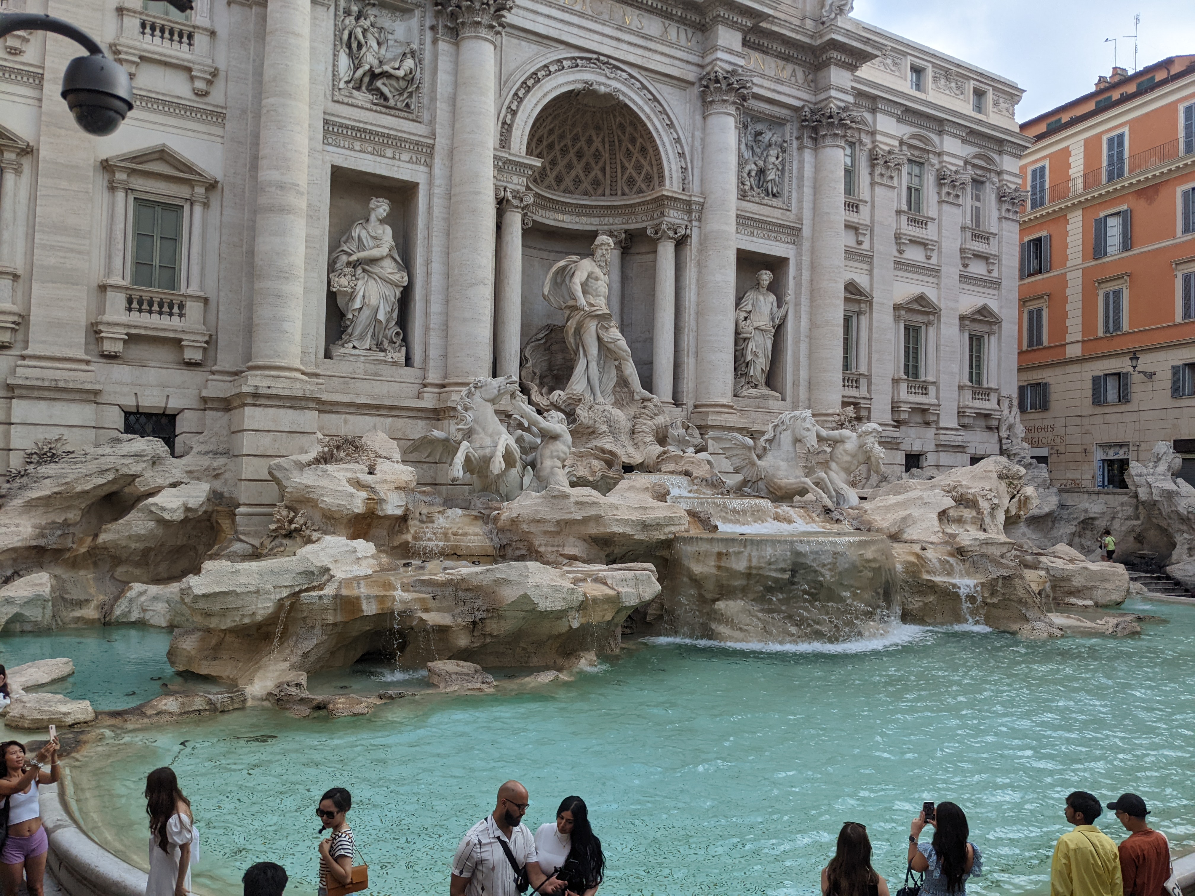 Insofern hab ich den Plan für den Nachmittag geändert: Zurück ins Hotel, Badesachen holen, um direkt nach der Engelsburg und einem Mittagessen Richtung Strand starten zu können. Ich bin auf dem Weg ins Hotel schnell über die Piazza Navona und am Trevi Brunnen vorbei, weil ich auf wenige Menschen gehofft hatte. Sicherlich weniger als nachmittags, aber selbst um 08:30 Uhr war da schon recht viel los.