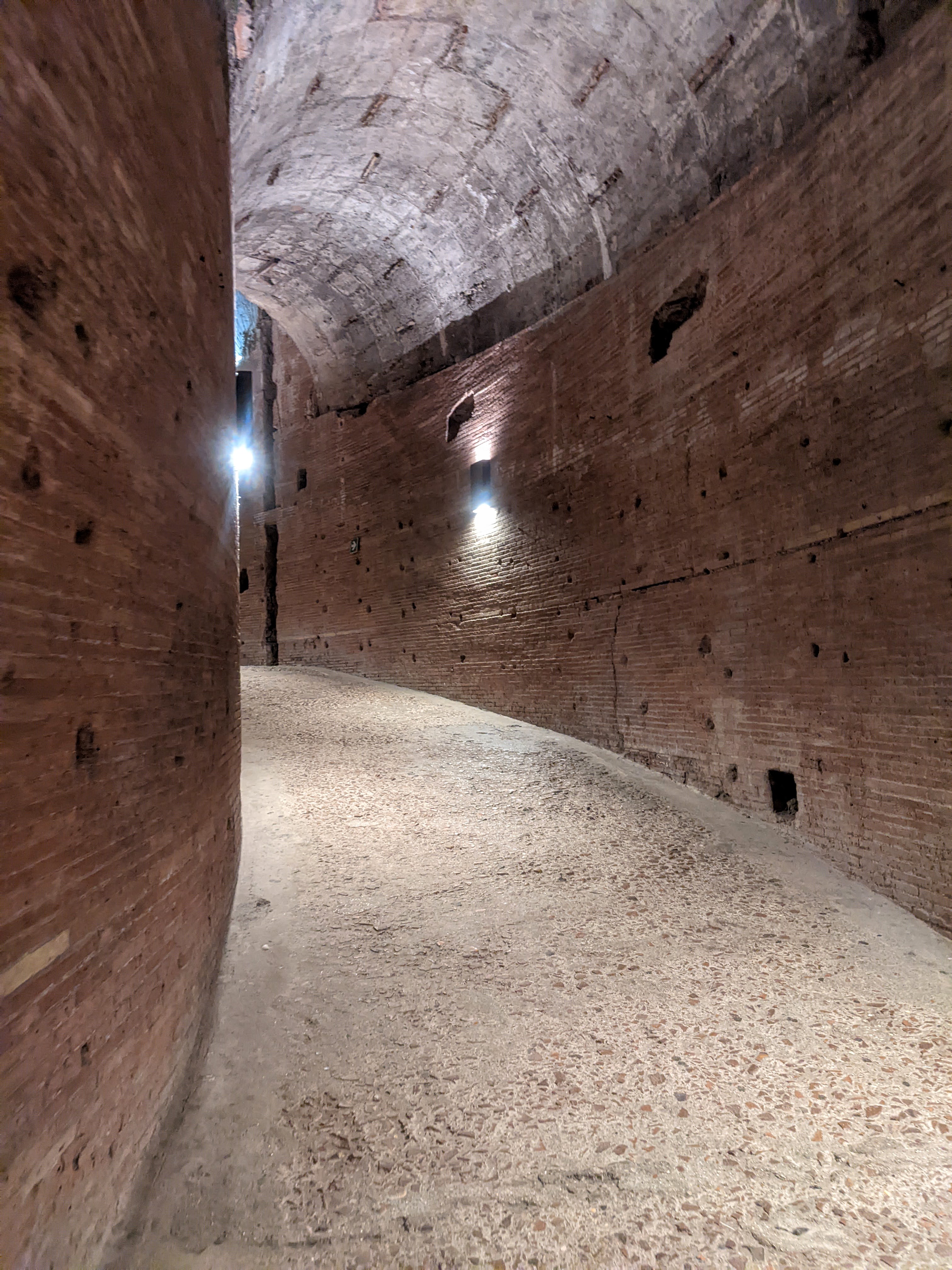 Von außen ist das Gebäude ja schon ziemlich beeindruckend, wenn man von der Engelsbrücke darauf zu geht. Wenn man dann aber durch die Außenmauern kommt, wird es richtig spannend. Man geht einen relativ schmalen Weg einmal innerhalb der quadratischen Außenmauern um den inneren, runden Teil. Dannach geht es einen riesigen Gang hinein, der drei Meter breit, zehn Meter hoch ist und vermeintlich nach 20 Metern endet.
