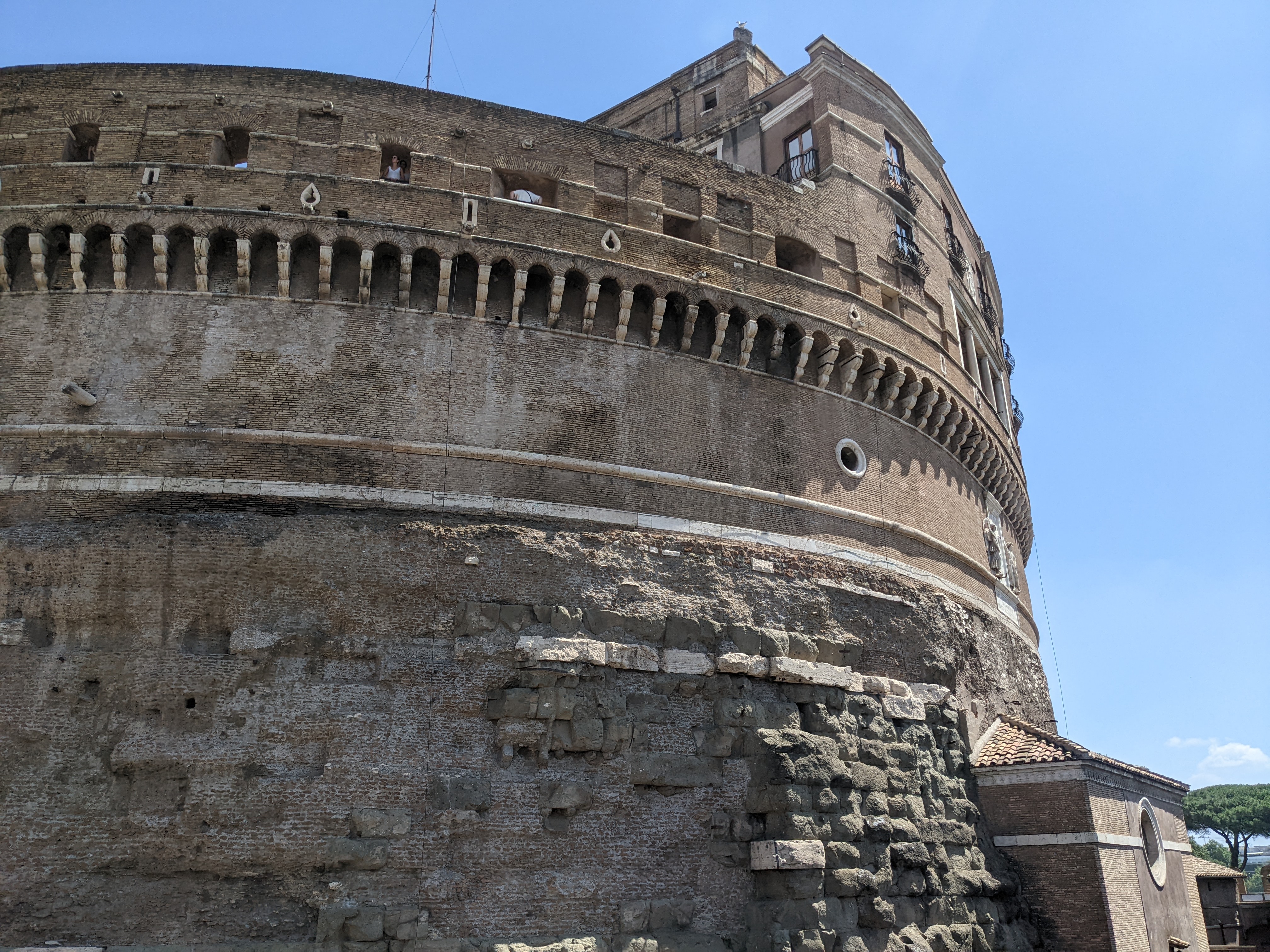 Ist man dann “drin”, steht man in einem Innenhof mit einer großen Skulptur eines Engels. Von dort kann man sich eine Aussstellung anschauen, die ich nicht besonders spannend fand, aber den Aspekt der Papstresidenz bzw. des -verstecks der Burg darstellt. Vom Innenhof geht es aber nochmals ein paar Treppen hoch in einen Rundgang mit tollem Ausblick auf den Tiber und Rom im Allgemeinen. Man sieht zum Beispiel das Aquädukt, welches den Vatikan mit der Engelsburg verbindet. Hier kommt der Festungsteil der Engelsburg zu gelten. Hier konnte aus Fenstern verschiedener Größe geschossen werden. Von dem ursprünglichen Mausoleum sieht man übrigens nichts mehr. Dafür wurde wohl zu oft umgebaut.