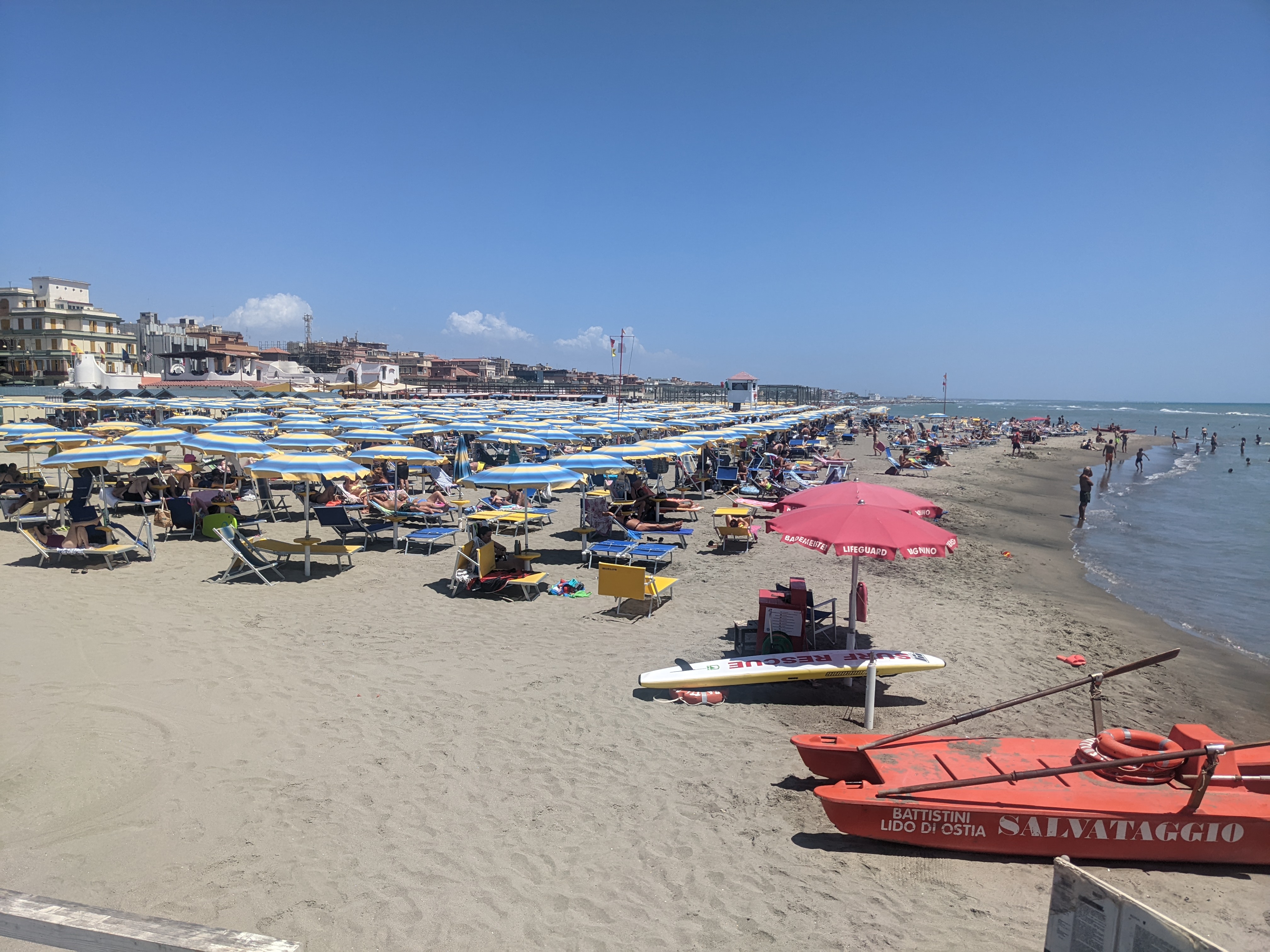 Angekommen im Vorort Ostia, musste ich noch eine halbe Stunde laufen, um von den ganzen Betonklötzen und Drehkreuzen weg zu einem Spiaggia Libera, einem freien Strand, zu kommen. Die meisten Strände dort sind kostenpflichtige Privatstrände, die mit Sonnenliegen und Schirmen komplett zugepflastert sind. Da will man nicht hin. An den freien Stränden kann man auch Liegen und sich Schirme mieten. Das macht aber der Großteil der Menschen nicht. Deswegen sieht man auch tatsächlich etwas vom Sand. Voll ist es dort aber trotzdem.