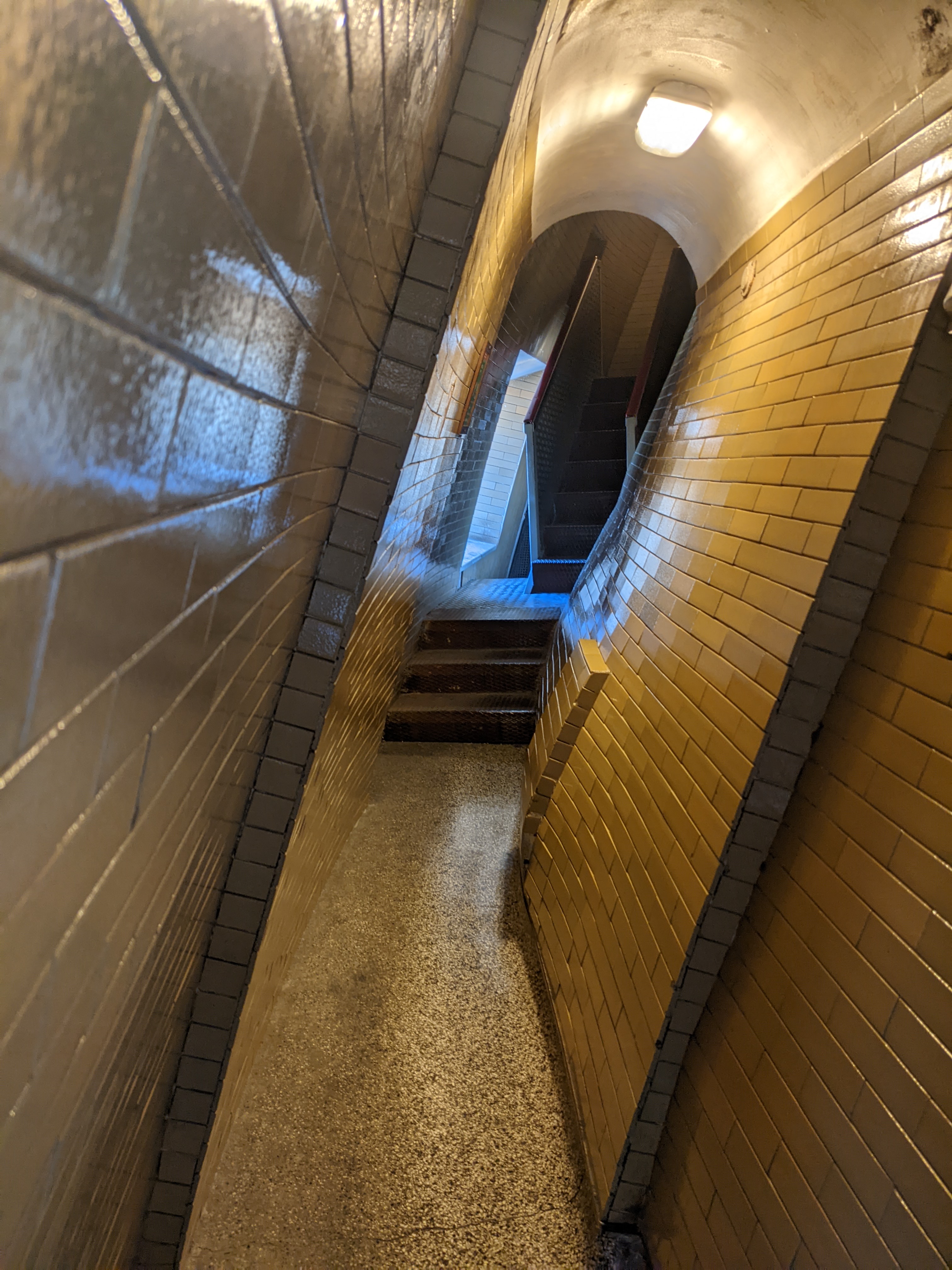 Der zweite Teil es Aufstiegs hat es dann aber in sich. Man hätte ja irgendwie drauf kommen können, dass bei einer Kuppel, die elliptisch zuläuft, der Weg nach oben irgendwie “krumm” sein muss. Aber dass sich die Außenwand so sehr krümmt und man komplett schräg laufen muss, hat mich überrascht. Die Art der Stufen wechselt gefühlt alle 20 Schritte. Es wird auf jeden Fall nicht langweilig, während man sich zum Teil wirklich durchquetschen muss. Das ist auch der Teil, wo logischerweise kein Fahrstuhl mehr fährt. Dort sind entsprechend viele keuchende Menschen vor einem, die gerade keinen Spaß im Urlaub haben und kurz vorm Kollabieren sind.