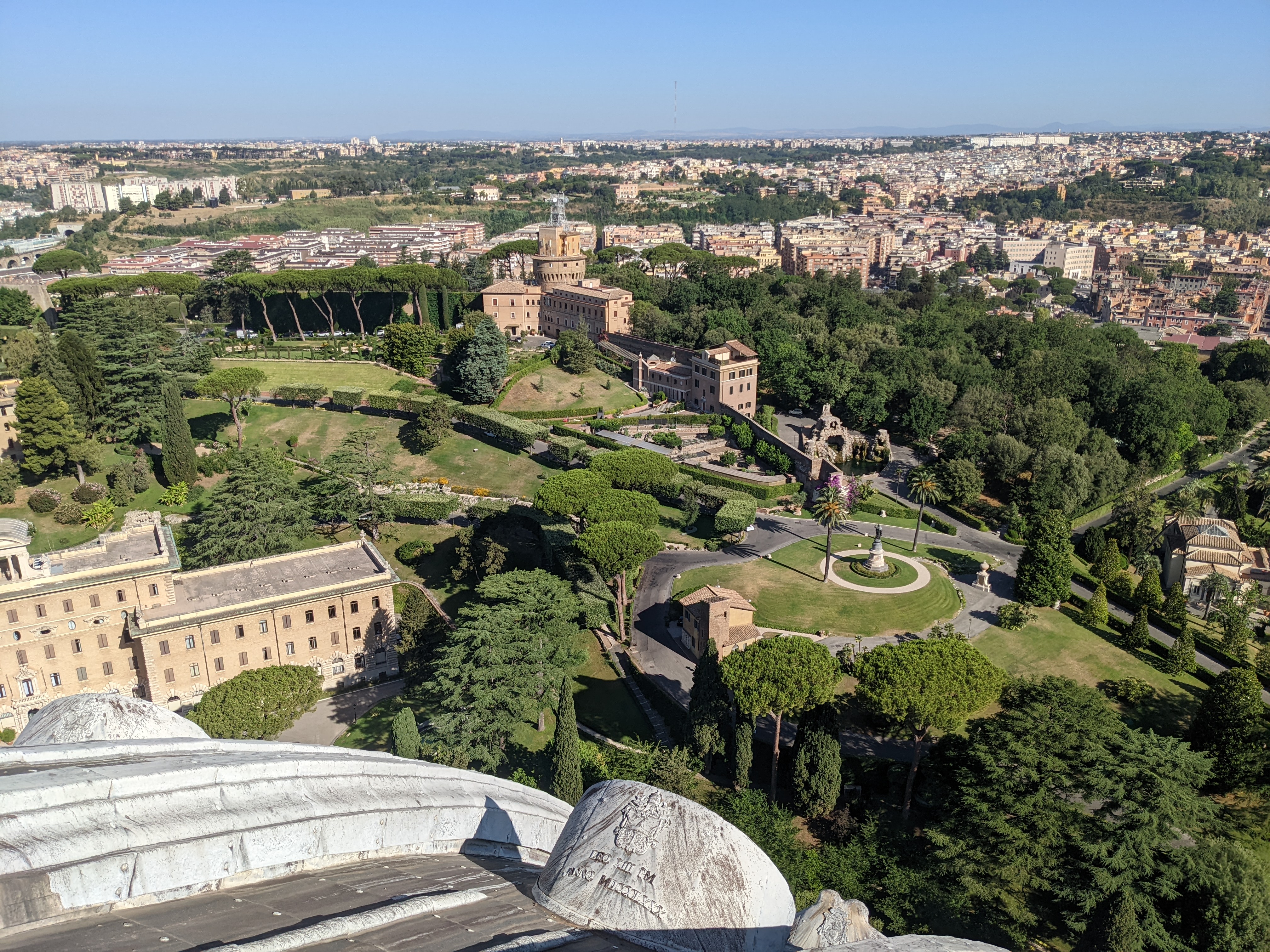 Oben angekommen, kann man einen wunderschönen Ausblick auf den Petersplatz, die Vatikanischen Gärten und auch die Engelsburg genießen. Einfach mal 10 Minuten in die Ferne starren und wirken lassen kann ich dort empfehlen. Nebenbei kommt man bei Bedarf auch wieder zu Atem.