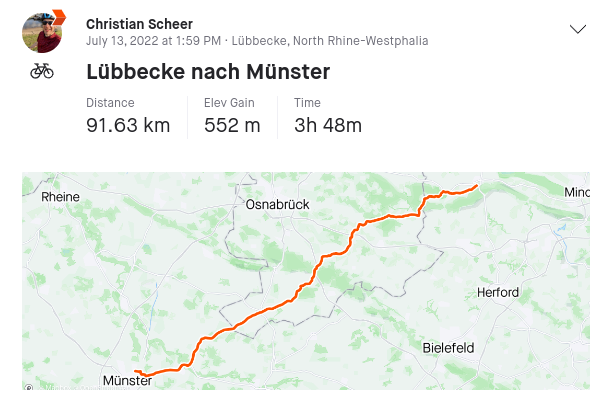 Da ich in Hannover aber 20 Minuten Verspätung und damit 55 Minuten Zeit bis zur nächsten S-Bahn hatte, hab ich mich entschieden, von dort mit dem Rad loszufahren. Wenn man Urlaub und keine Termine hat, kommt es ja auf drei Stunden nicht an. Und die Beine fühlen sich noch ganz ok an, um nochmal knappe 90 km auf die Woche draufzulegen.